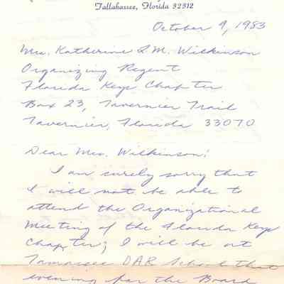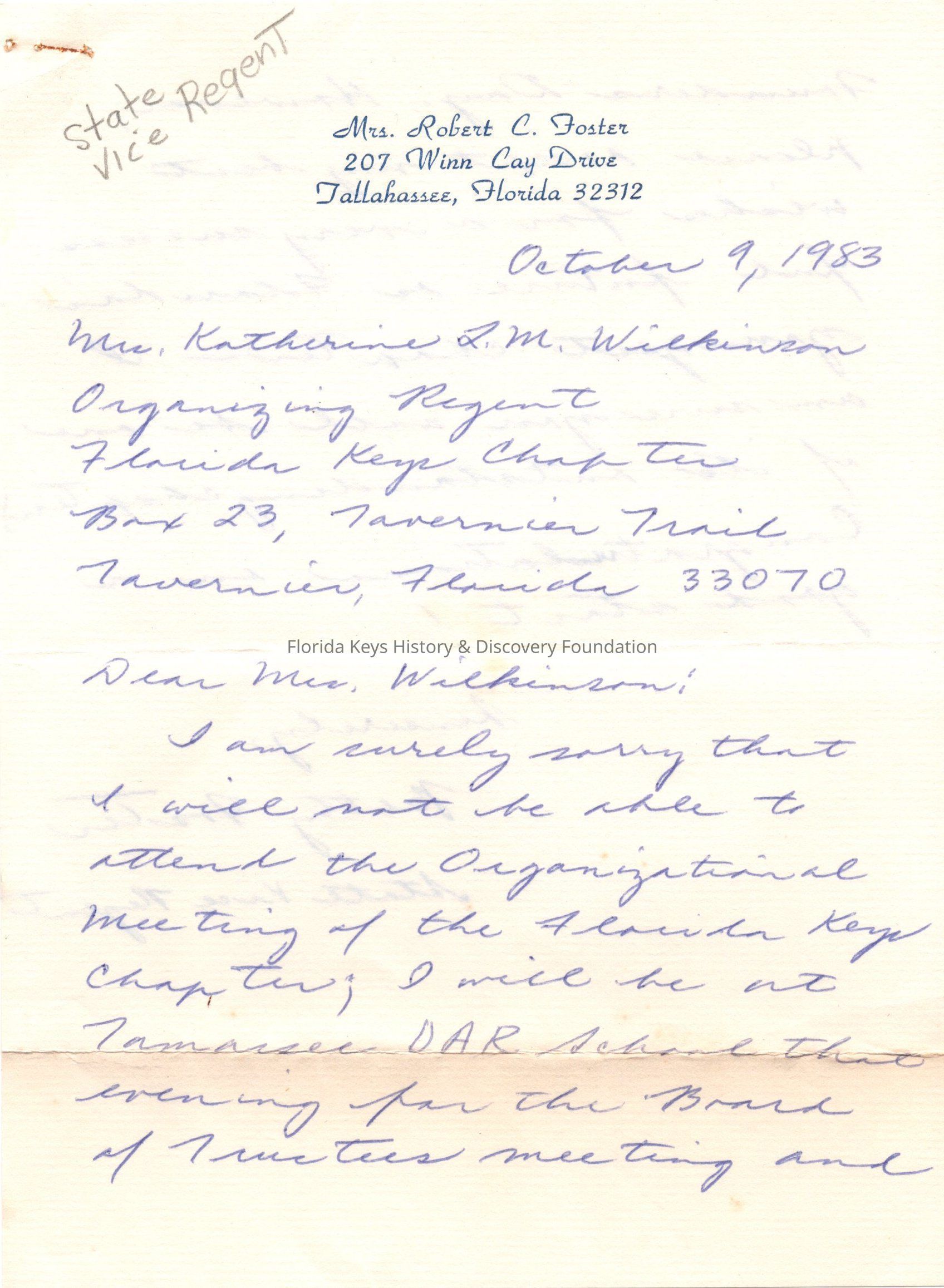 Mrs. Foster regrets that she can not attend Organization Meeting of the Florida Keys ChapterCollection