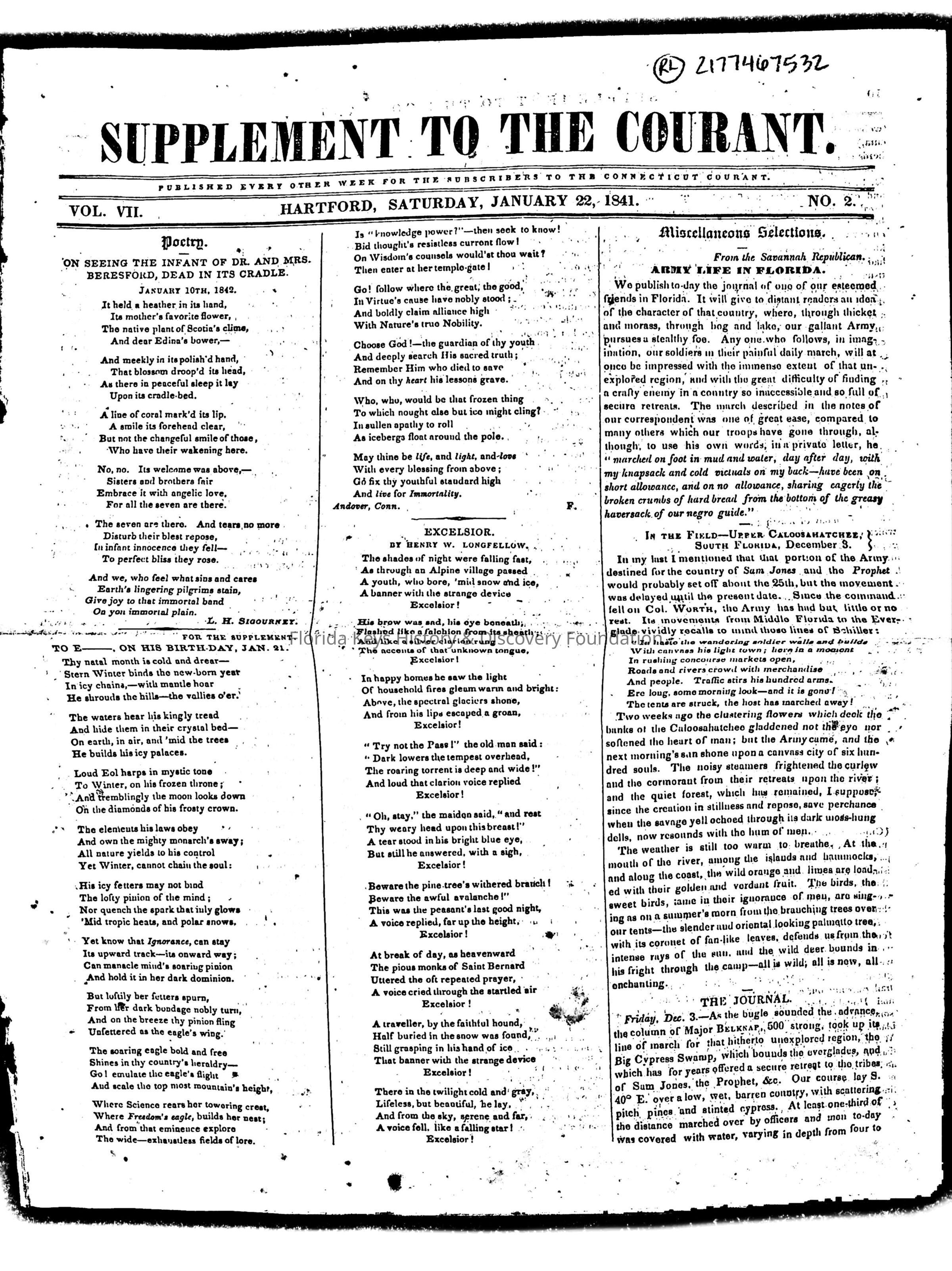 Newspaper from 1841 needs to be placed in mylar sleeve when they become available. It is the first document in folder 1 and has a digitized copy.Created By