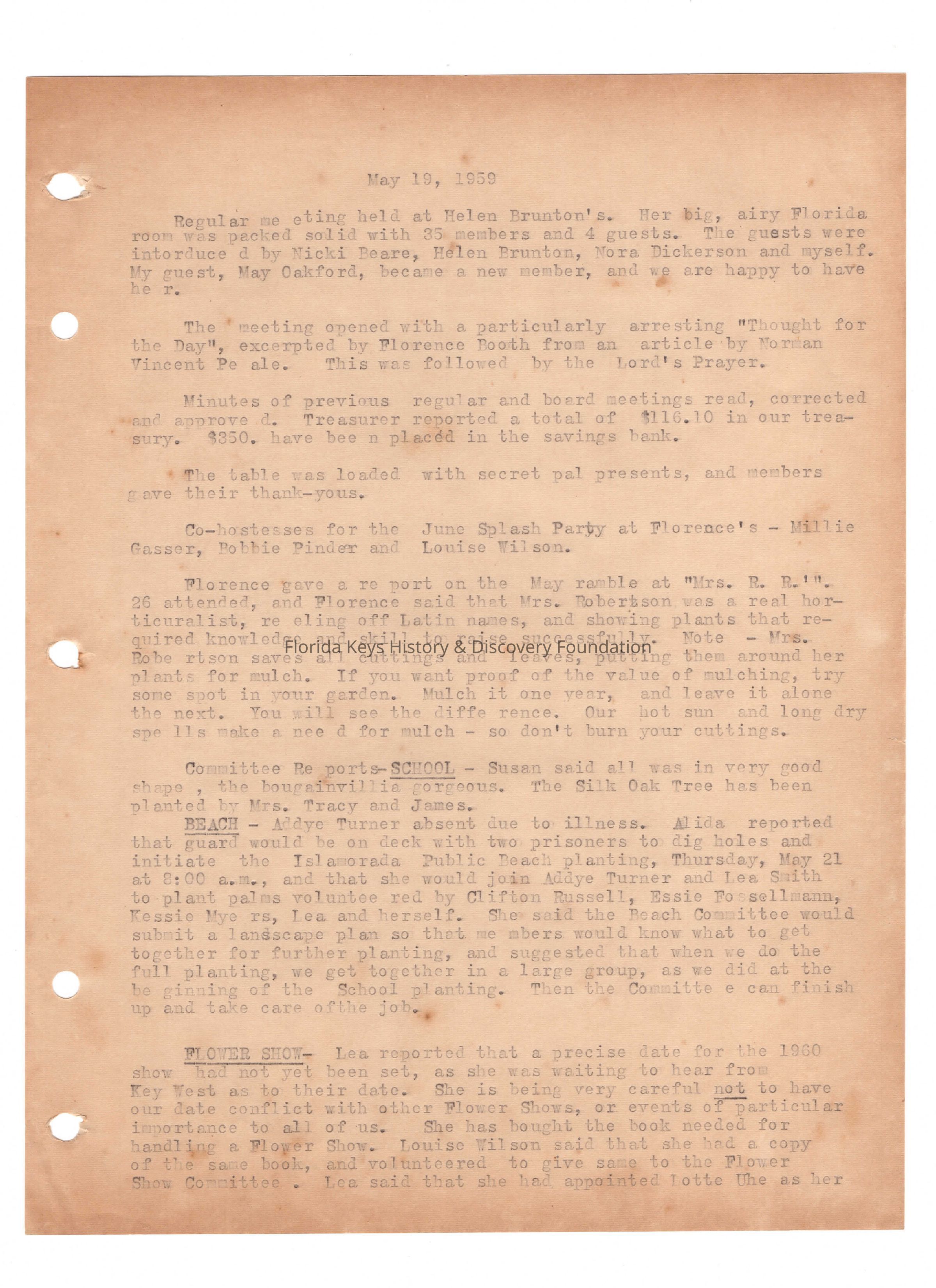 Minutes from club meeting held on May 19th, 1959 at the home of Hele Brunton.Collection