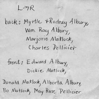 Left to right Back row: Myrtle and Rodney Albury, William Ray Albury, Marjorie Matlock, and Charles Pellicier Front row: Edward Albury, Dickie Matlock, Donald Matlock, Alberta Albury, Bo Matlock, May Rose Pellicier