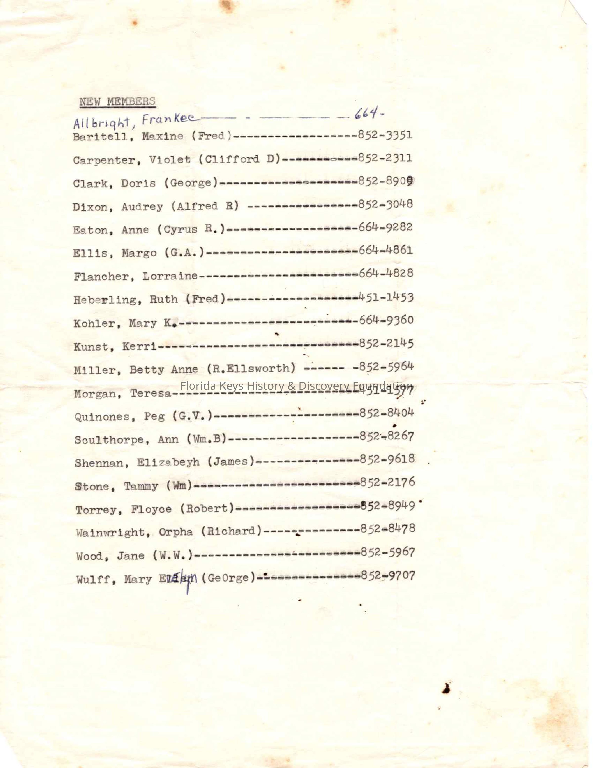 Garden Club of the Upper Keys, Allbright Frankee, Maxine Baritell, Fred Baritell, Violet Carpenter, Clifford D Carpenter, George Clark, Doris Clark, Audrey Dixon, Alfred B Dixon, Anne Eaton, Cyrus S. Eaton, Margo Ellis, G. A. "Jerry" Ellis, Lorraine Flancher, Fred B Heberling, Ruth Heberling, Mary Kay Kohler, Kerri Kunst, Betty Anne Miller, R. Ellsworth Miller, Teresa Morgan, Peg Quinones, G.V. Quinones, Ann Sculthorpe, Wm.B. Sculthorpe, Elizabeth Shennan, James Shennan, Tammy Stone, Wm. Stone, Floyce Torrey, Robert Torrey, Richard Wainwright, Orpha Wainwright, Jane Wood, W.W. Wood, Mary Ellen Wulff, George Wulff