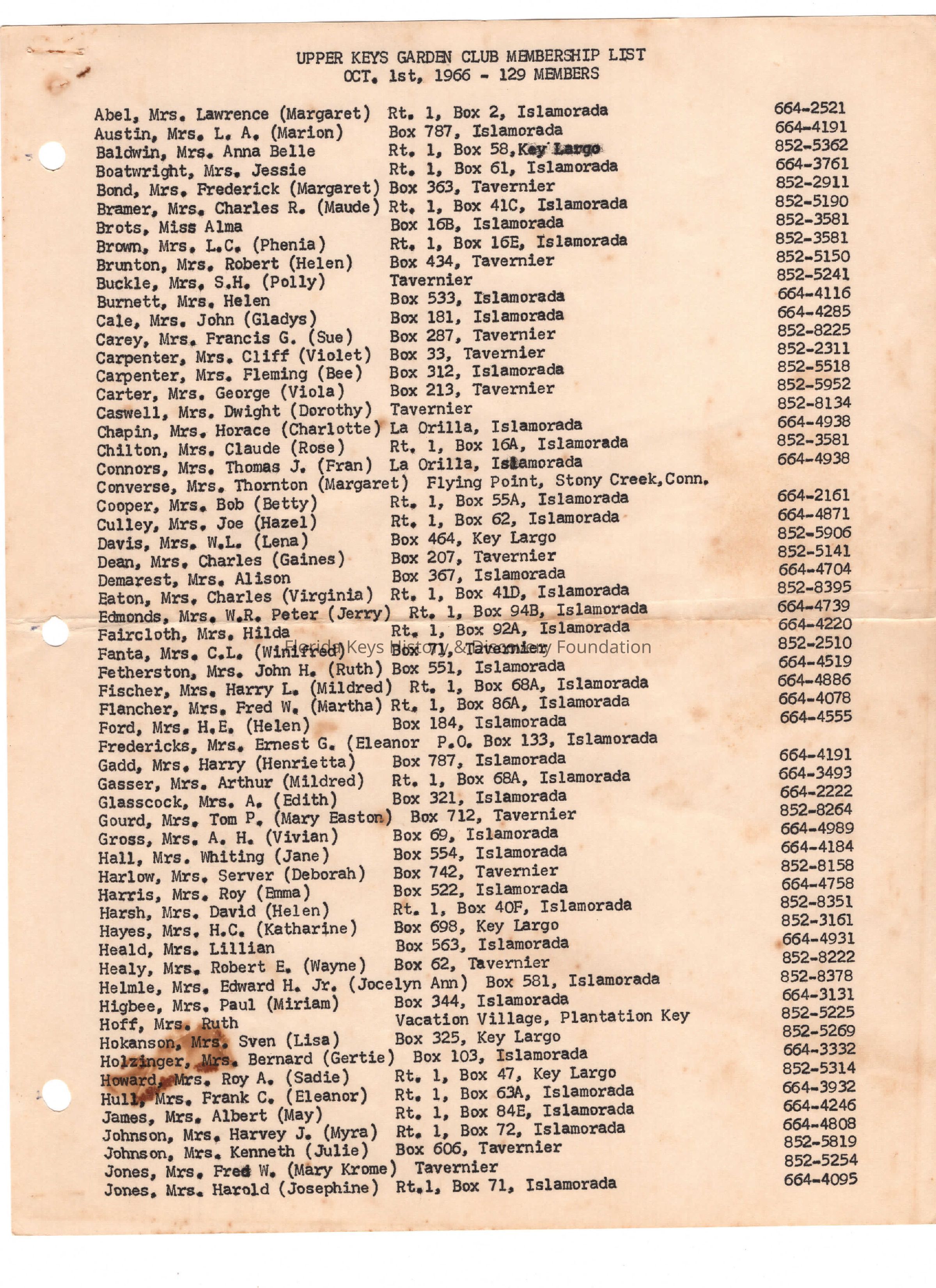 Typed list of 129 members from October 1st, 1966. Three pages. Includes names, address, and phone numbers.Collection