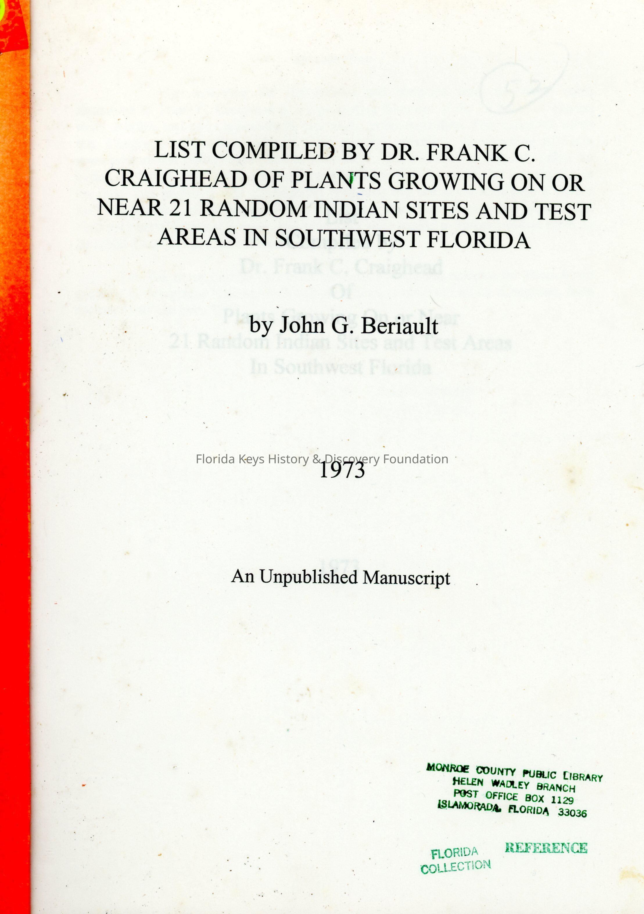 List Complied By Dr. Frank C. Craighead of Plants Growing on or Near 21 Random Indian Sites and Test Areas in Southwest FloridaEntry/Object ID