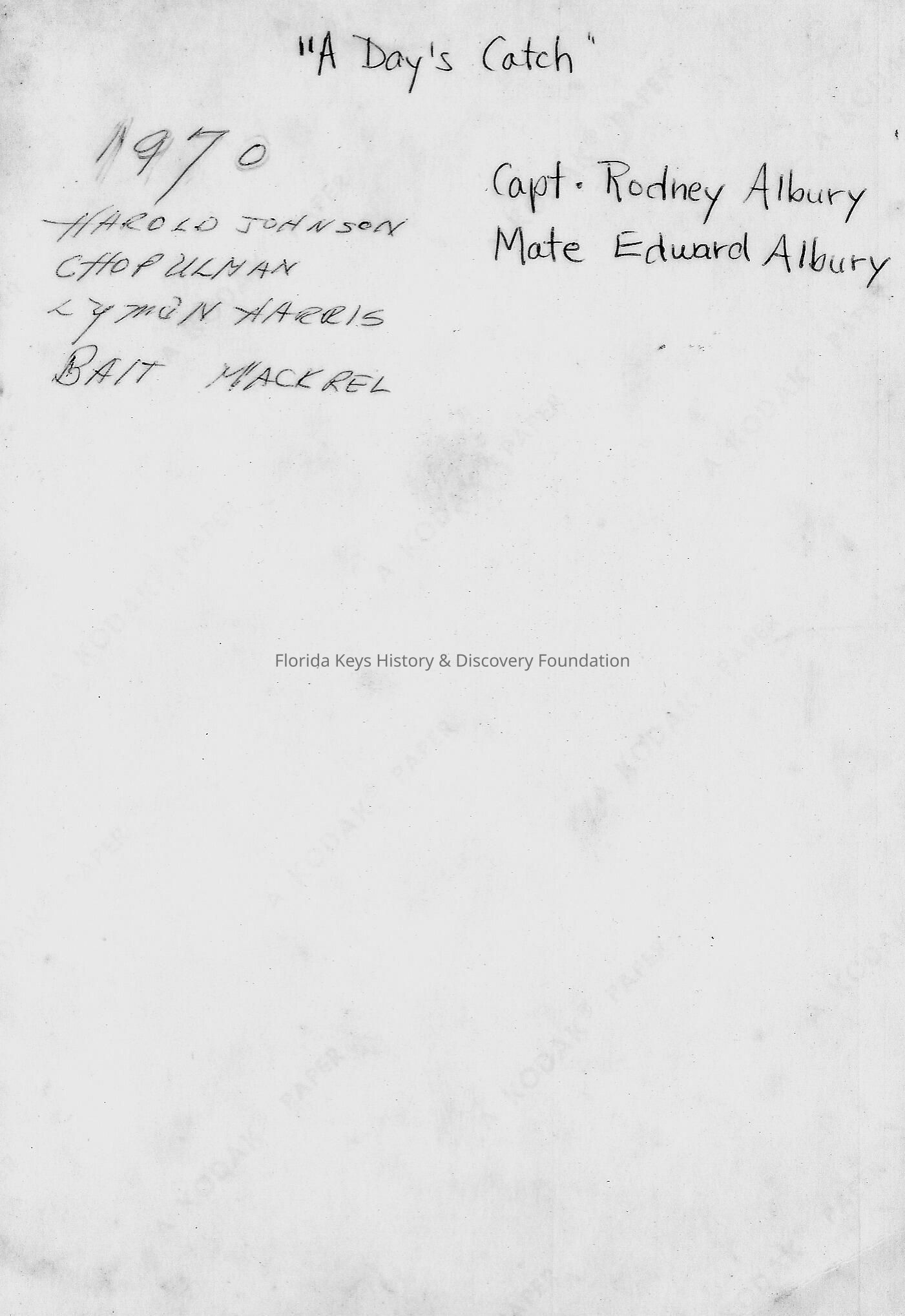 back of photo with caption "A Day's Catch", "1970: Harold Johnson, Chop Ulman, Lyman Harris, Bait Mackrel, Capt. Rodney Albury, Mate Edward Albury"Collection