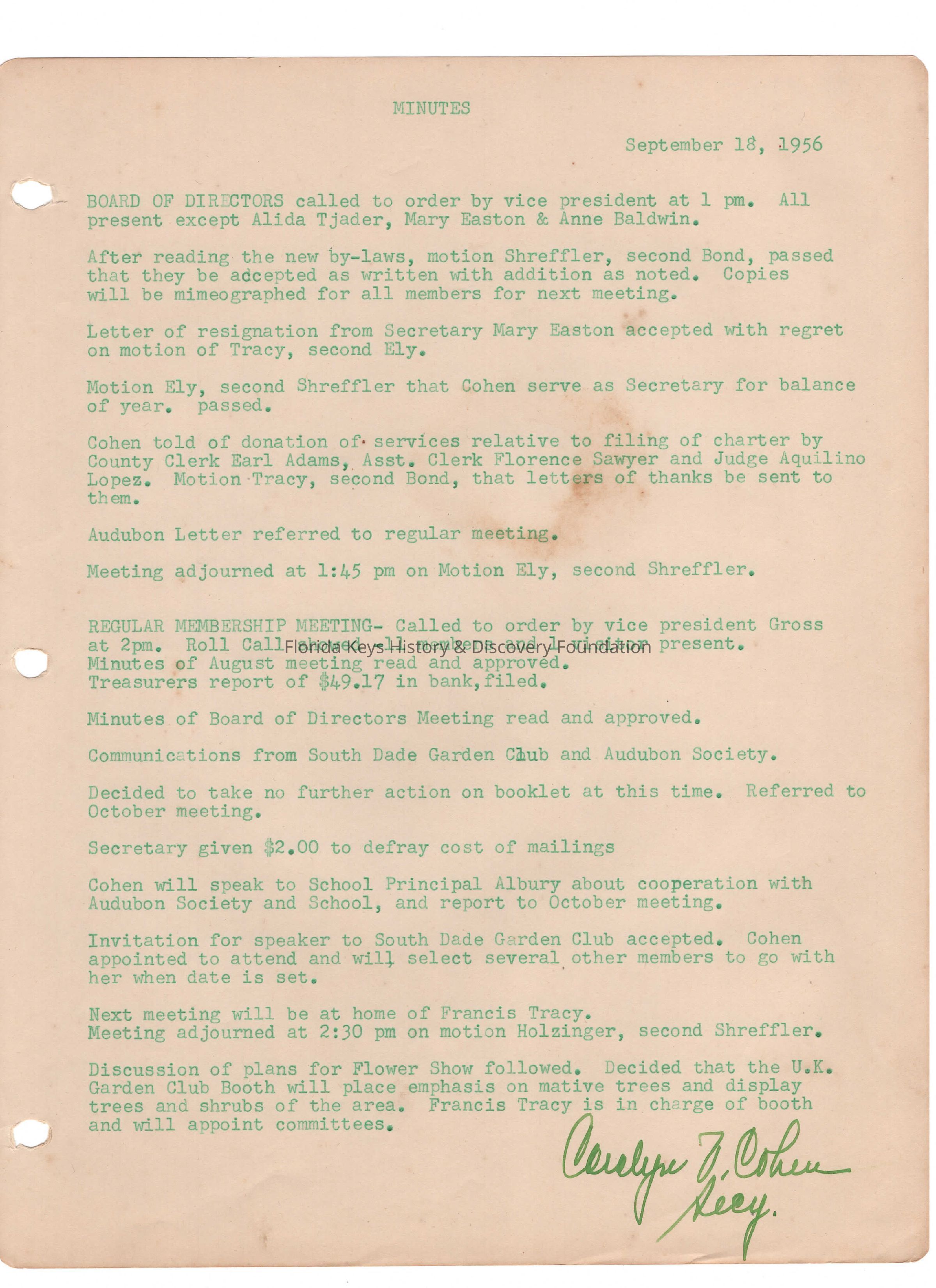 Minutes from club meeting held on September 18th, 1956 at the home of Mrs. Vivian Gross.Collection
