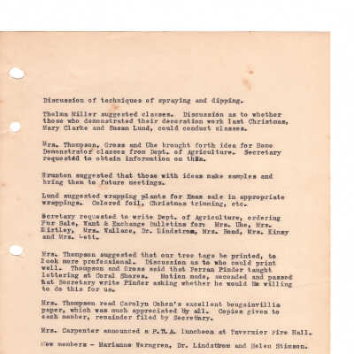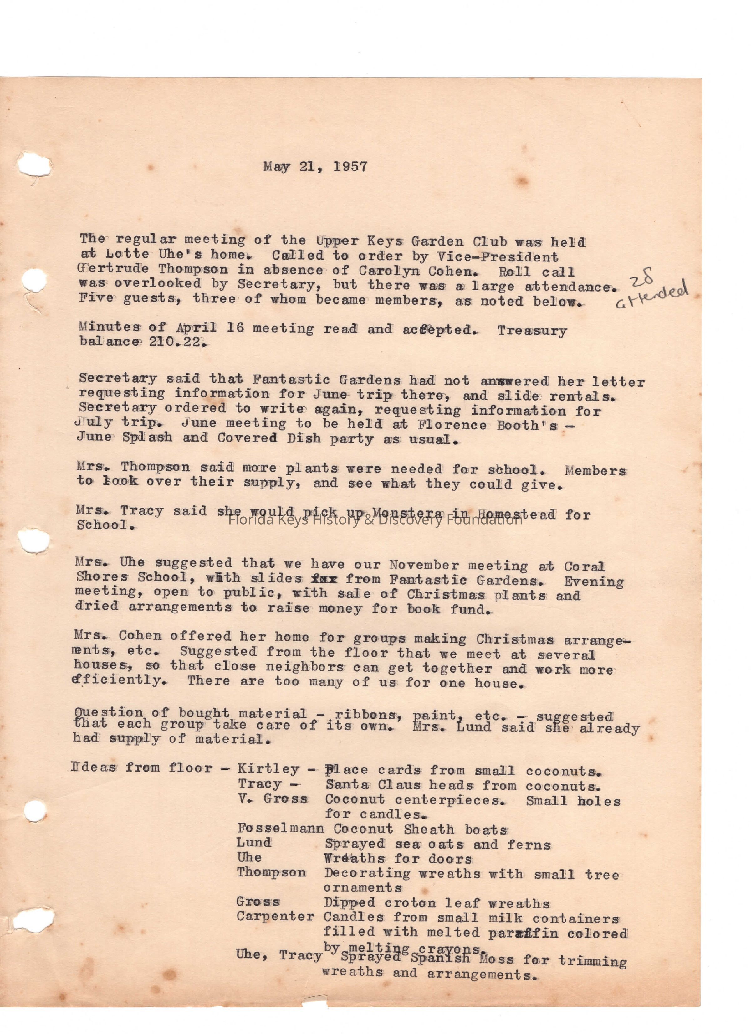 Lotte Uhe, Carolyn Cohen, Gertrude Thompson, Frances Tracy, Vera Kirtley, Vivian Gross, Essie Fosselman, Susan Lund, Violet Carpenter, Alida Tjader, Thelma Miller, Mary Clarke, Marianne Werngren, Helen Stimson, Margaret Bond, Willabel Kinzy, Patricia Lett, Garden Club of the Upper Keys