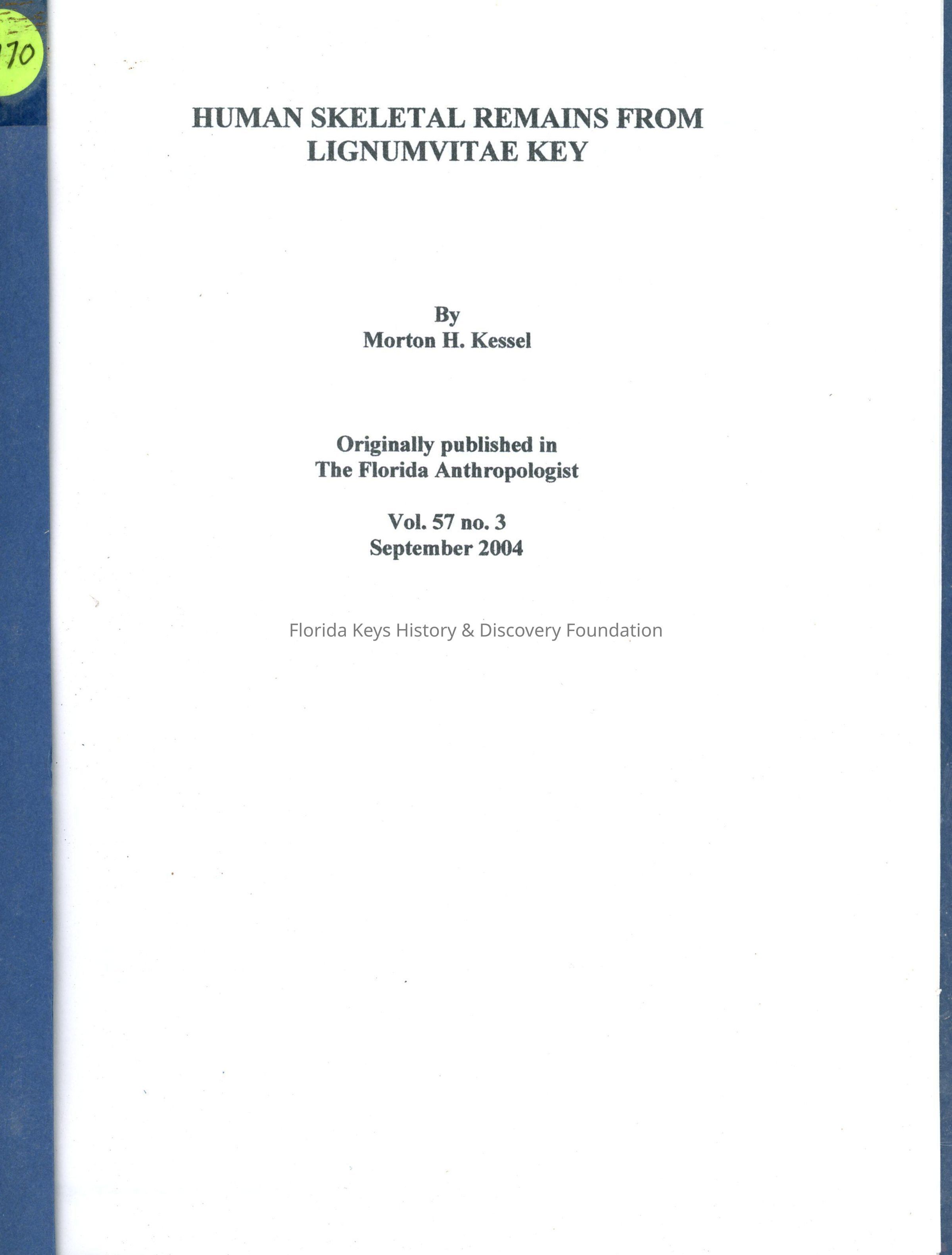 Florida Anthropologist, The Florida Anthropologist, Morton H. Kressel, Lignum Vitae Key, Lignumvitae KeyDescription