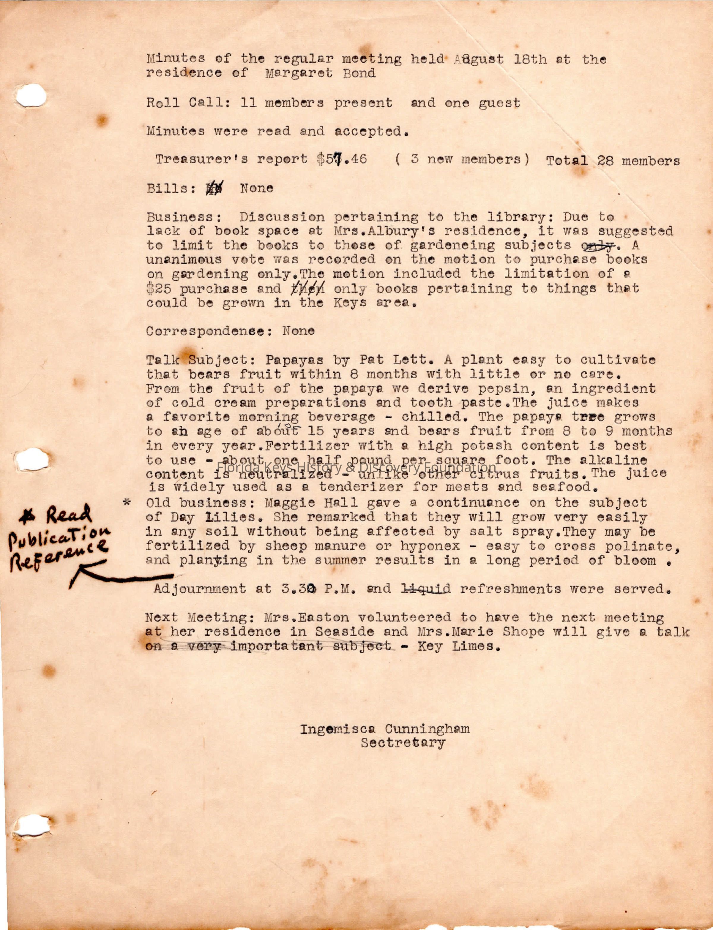 Minutes from meeting held on August 18th, 1953 at the home of Mrs. Margaret Bond.Collection