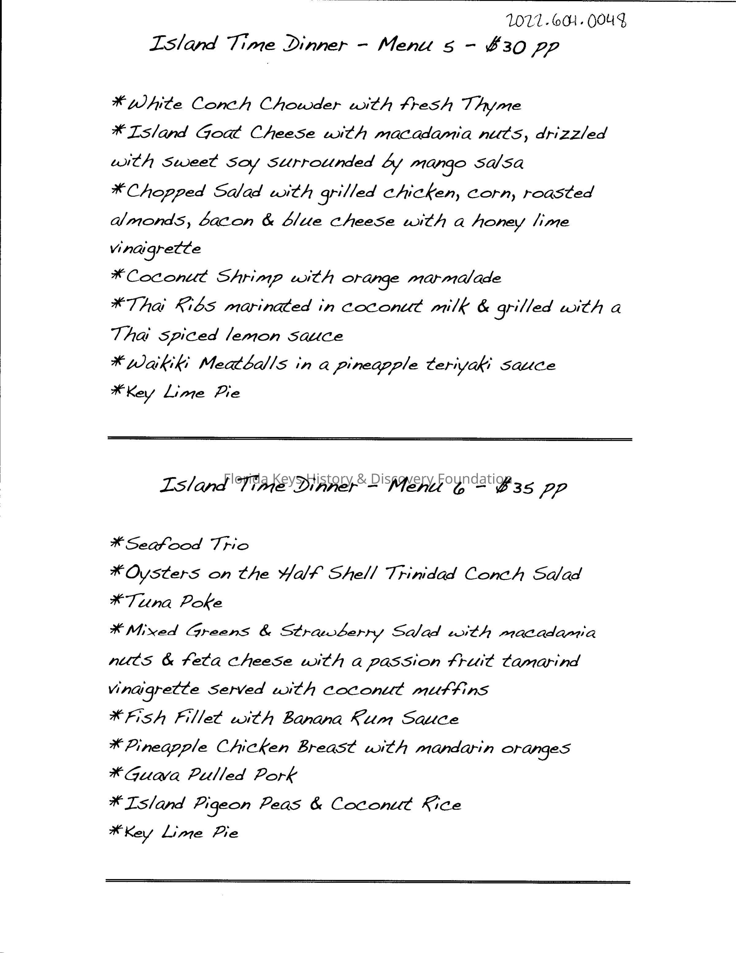 Printouts regarding Island Time dinner for the Garden Club. Includes menus, plans, and emails.