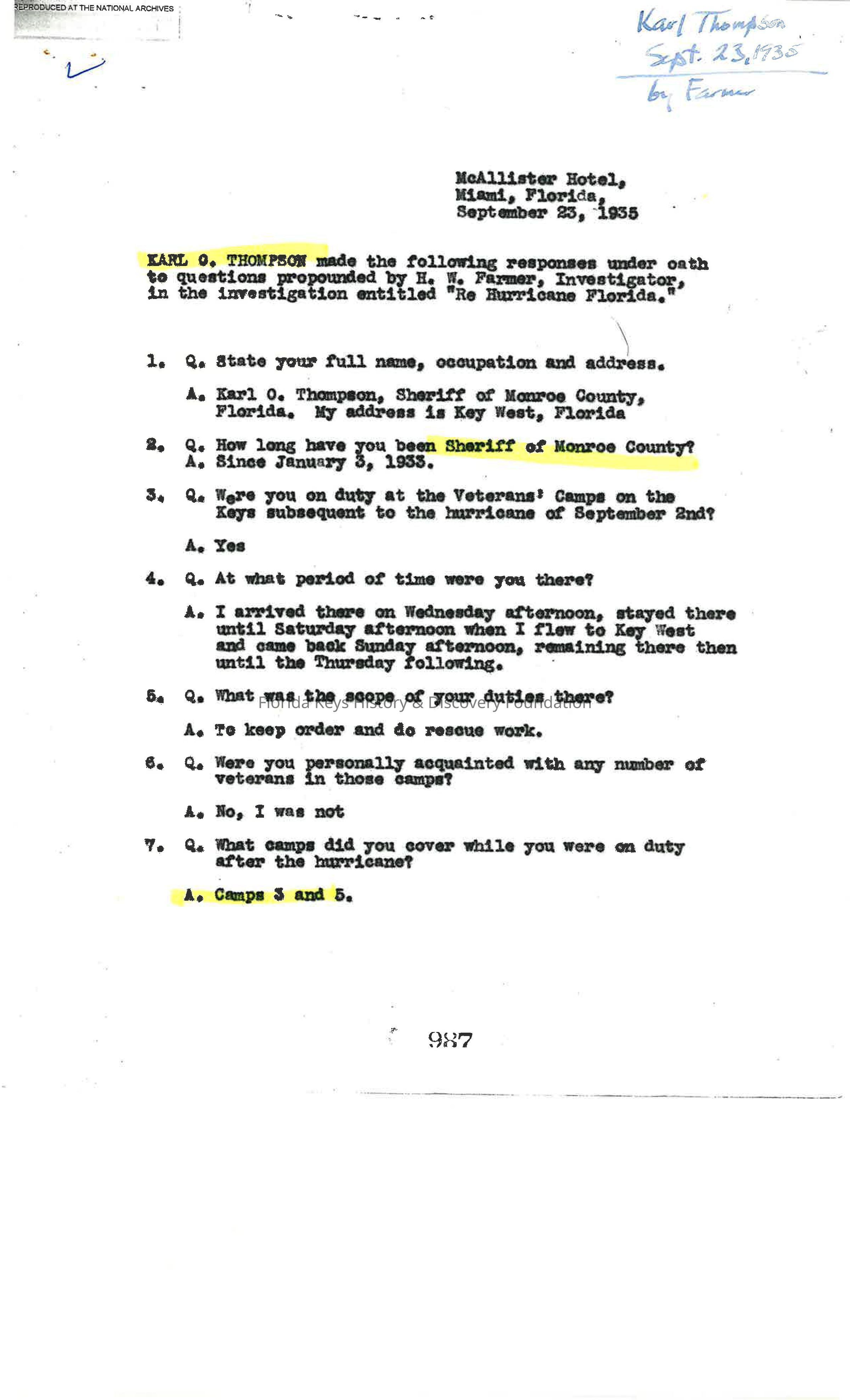 Sept. 25, 1935, "Karl O. Thompson made the following responses under oath to questions propounded by H. W. Farmer, Investigator, in the investigation entitled 'Re Hurricane Florida.'"Creator