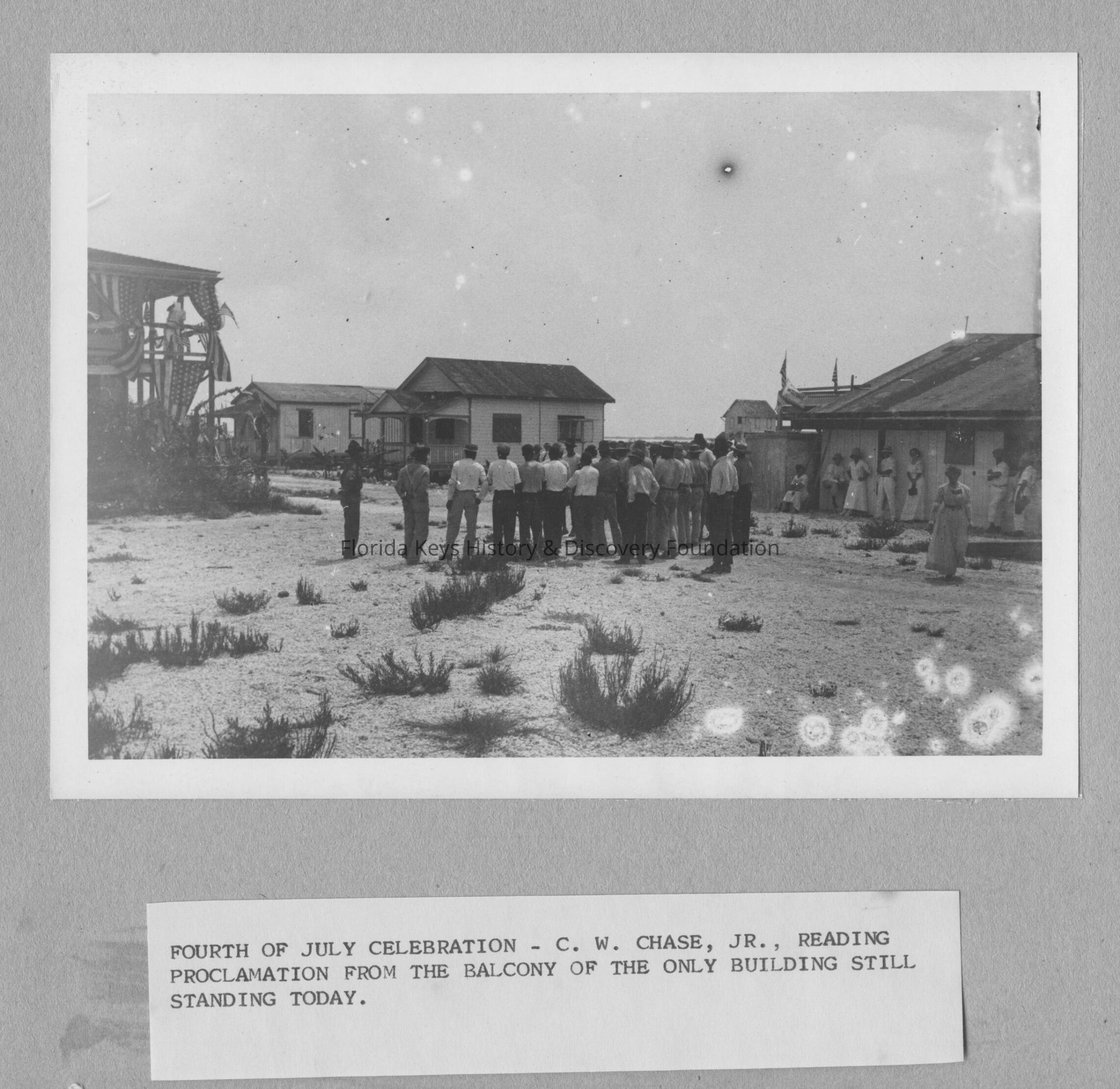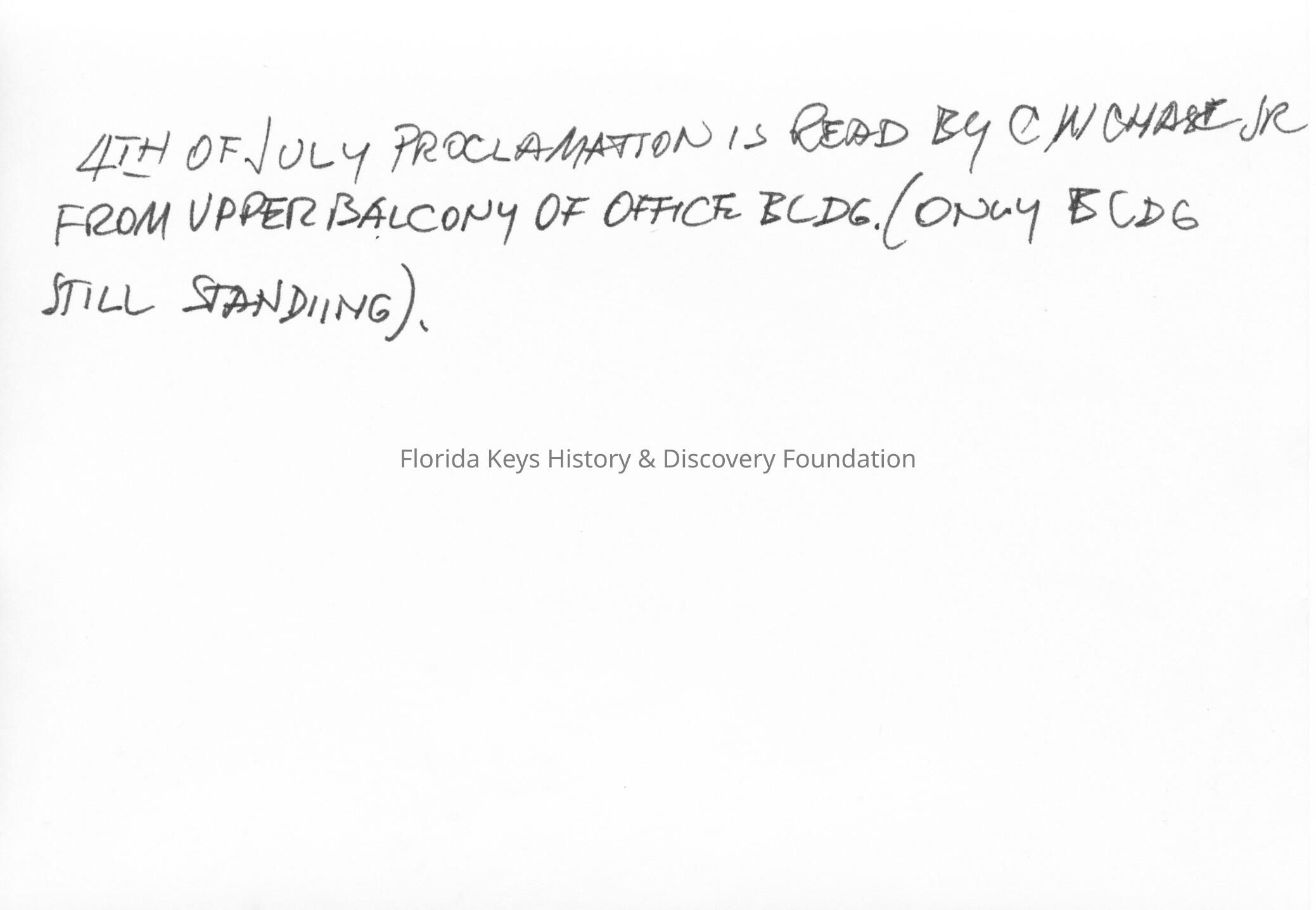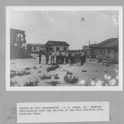back of photo captioned "4th of July Proclamation is read by CW Chase Jr from Upper Balcony of Office Bldg. (only BCDG still standing)."Collection