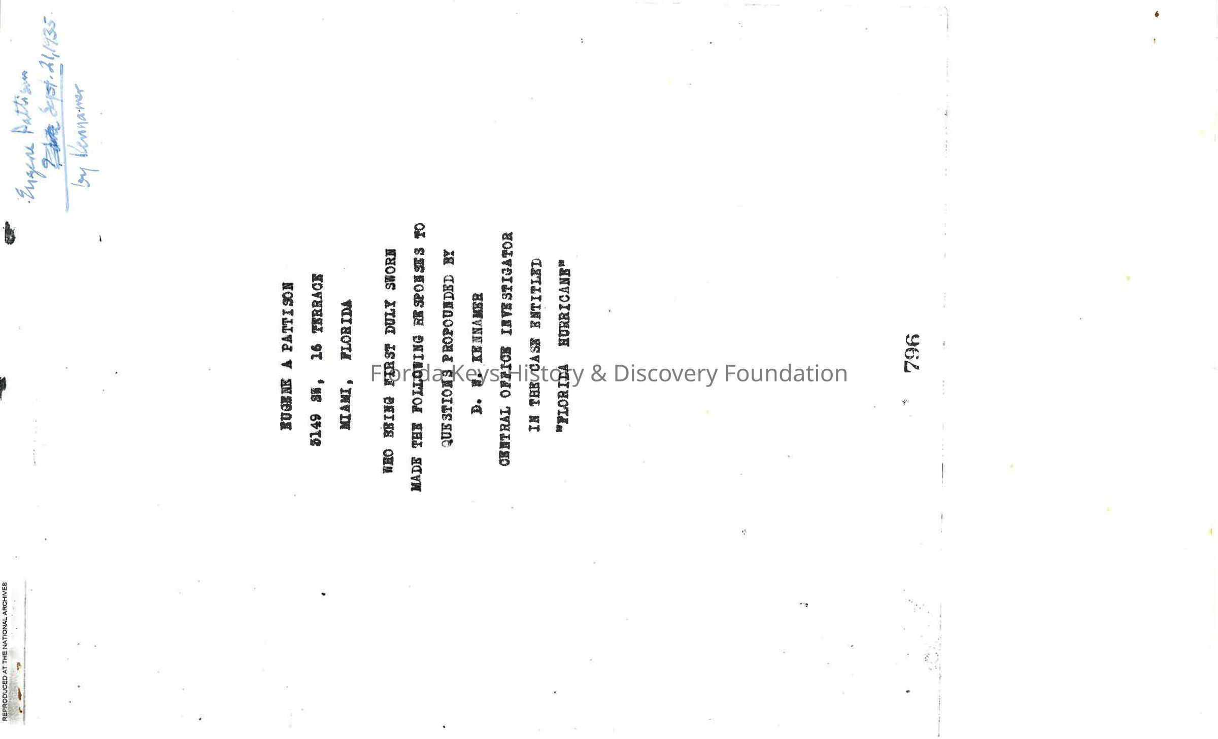 Sept. 21, 1935, "Eugene A. Pattison...who being first duly sworn made the following responses to questions propounded by D. W. Kennamer, Central office Investigator in the case entitled 'Florida Hurricane.'"Creator
