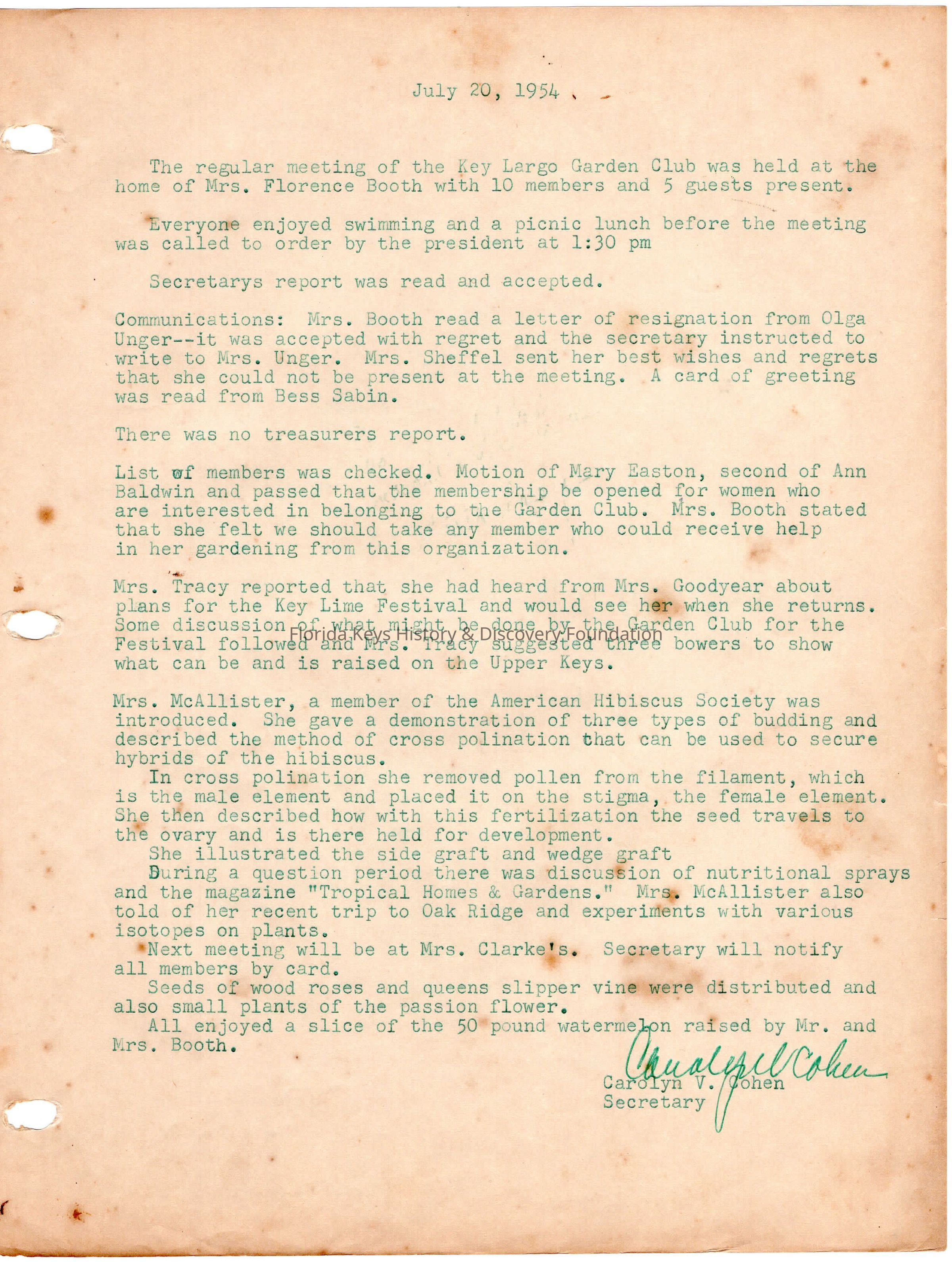 Minutes from club meeting held on July 20th, 1954 at the home of Mrs. Florence Booth.Context