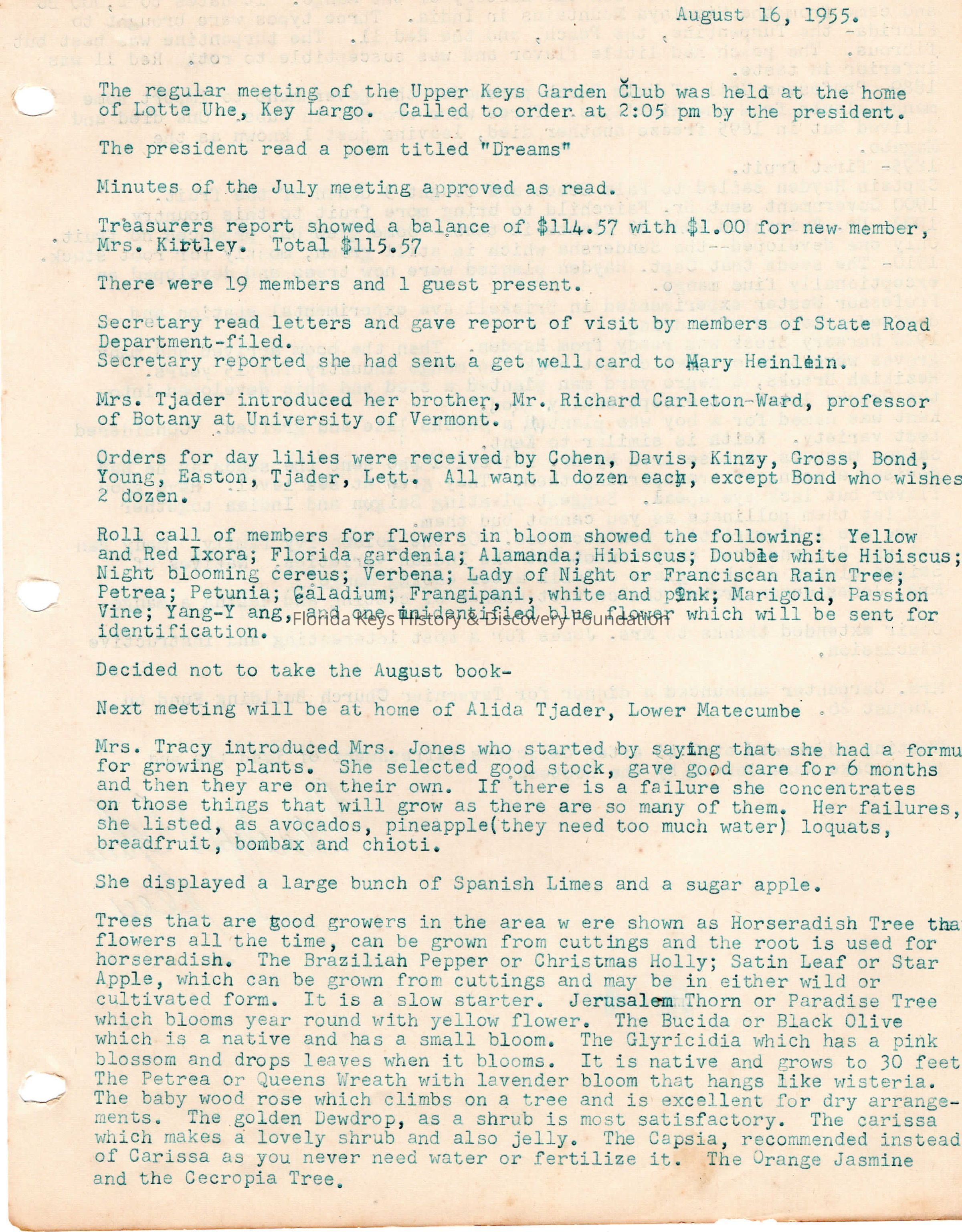 Minutes from club meeting held on August 16th, 1955 at the home of Mrs. Lotte Uhe.Collection