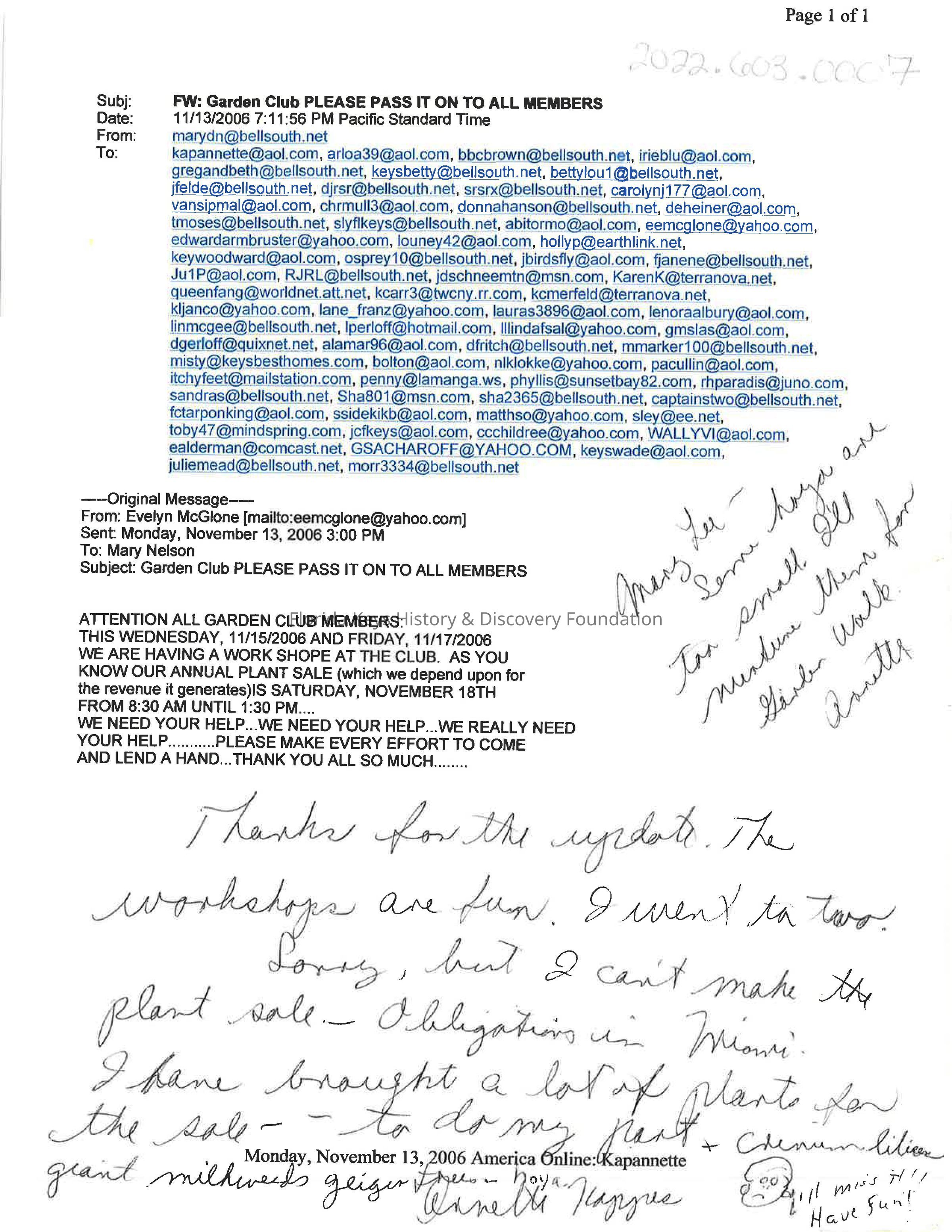 Garden Club email from Mary Nelson to all Garden Club members, forwarded from Evelyn McGlone. November 2013, 2006. A plea for help. Includes handwritten notes.
