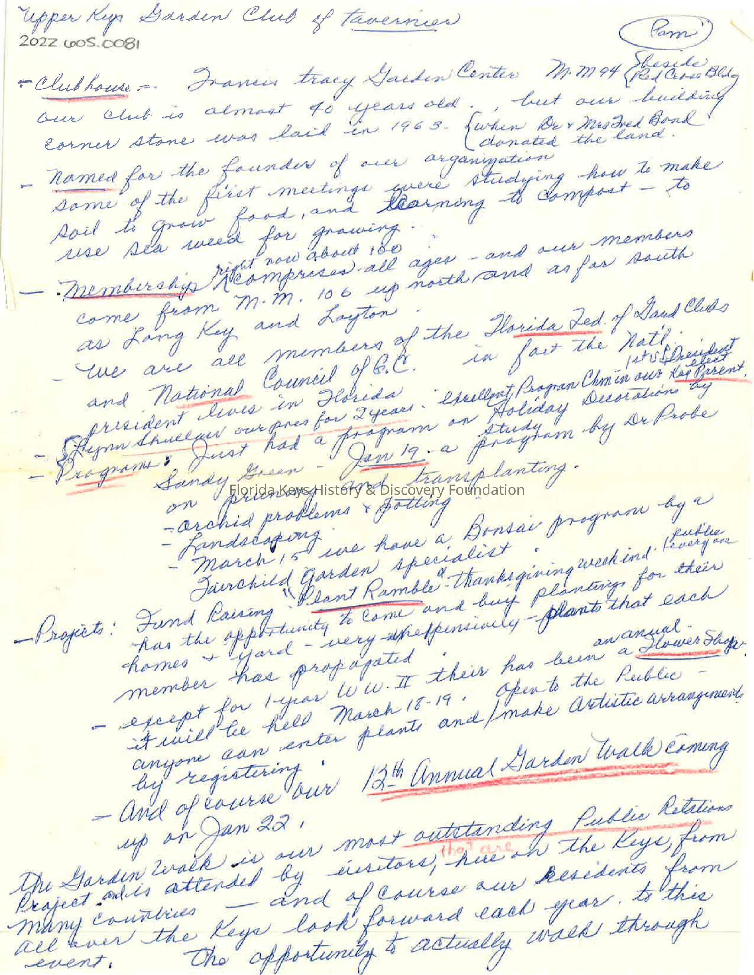 Ca. 1990s Handwritten notes about the Garden Club, its history, building, projects, and programs.