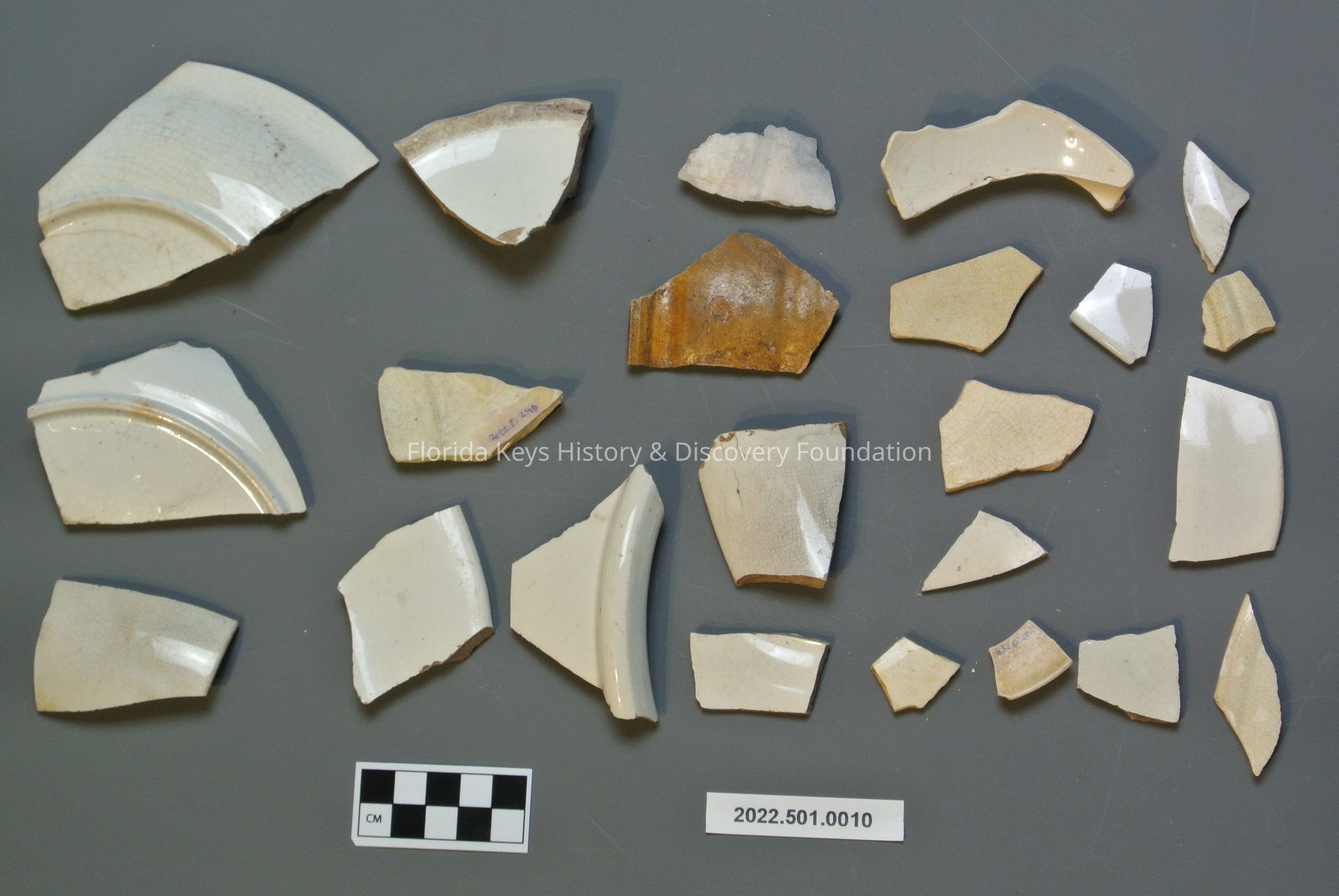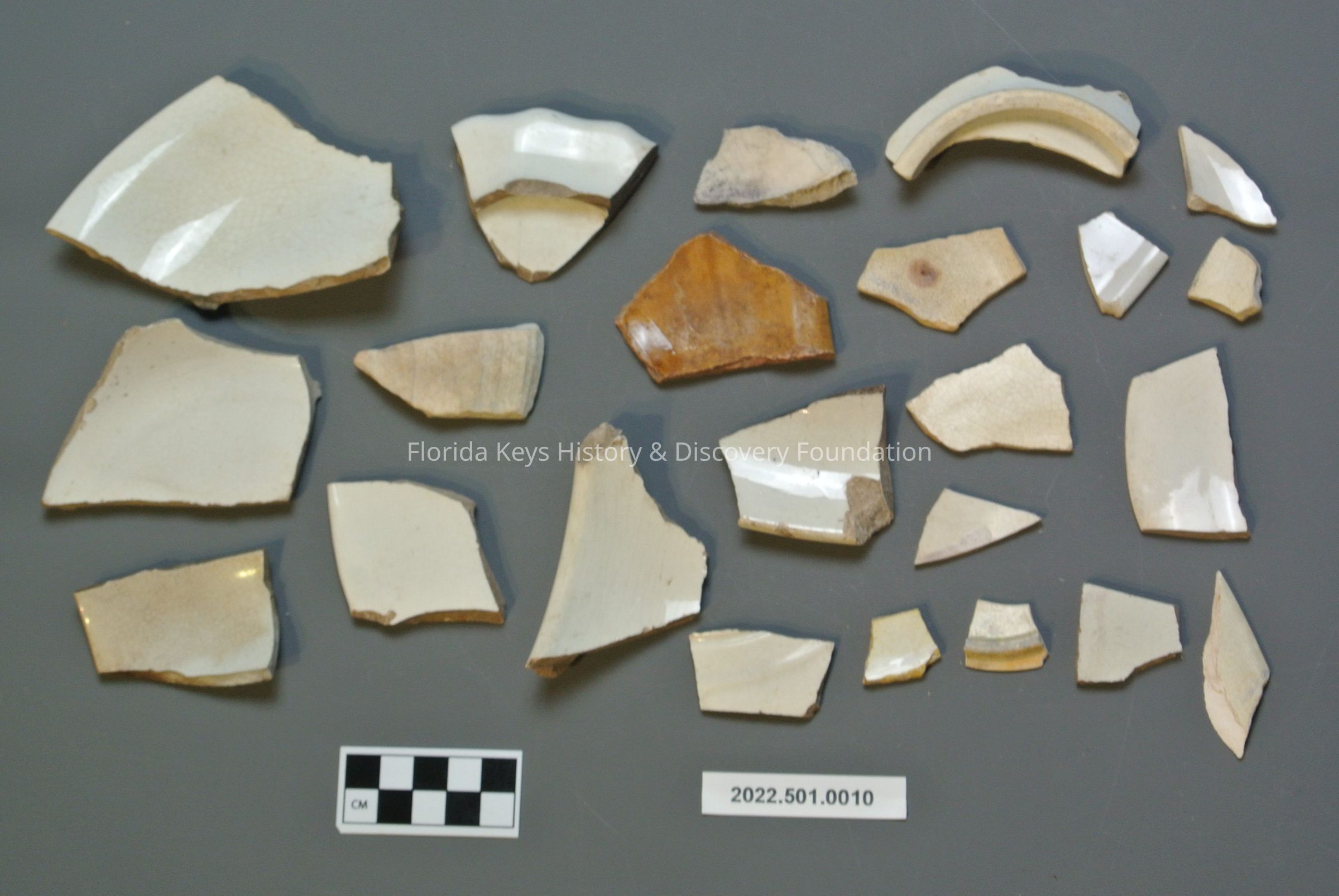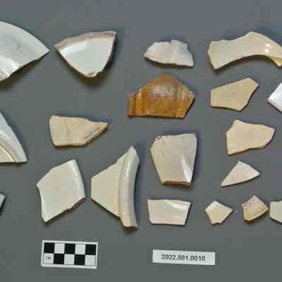 Group of ceramic sherds that are mainly white, with one golden brown sherd.Collection