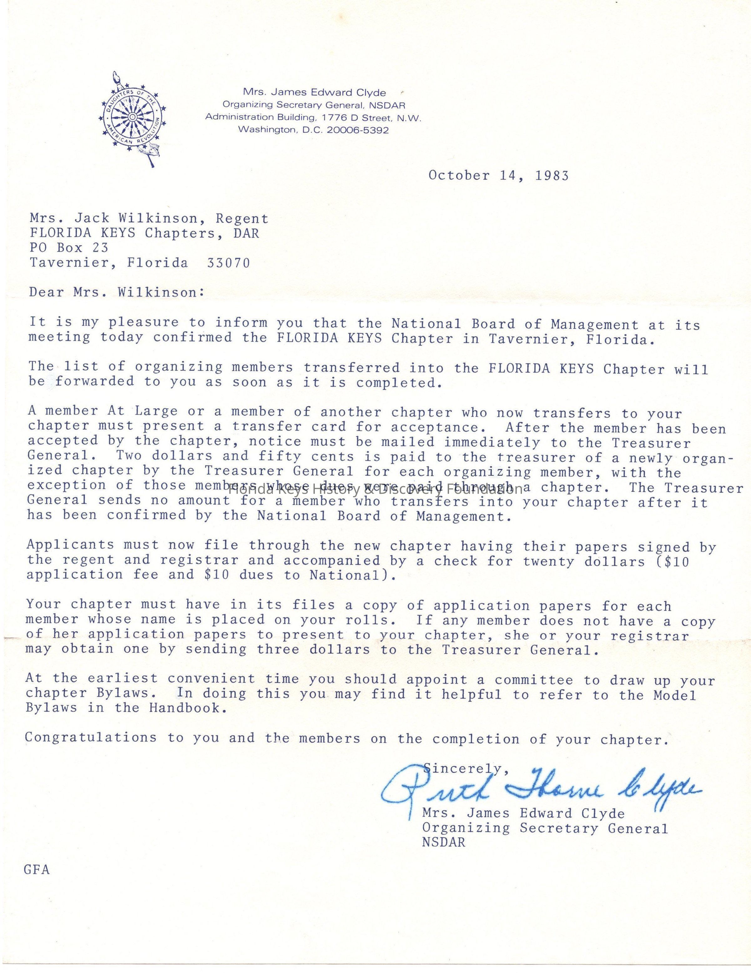 Approval Letter for Chapter's Organization from Mrs. James Edward Clyde, 1983Entry/Object ID