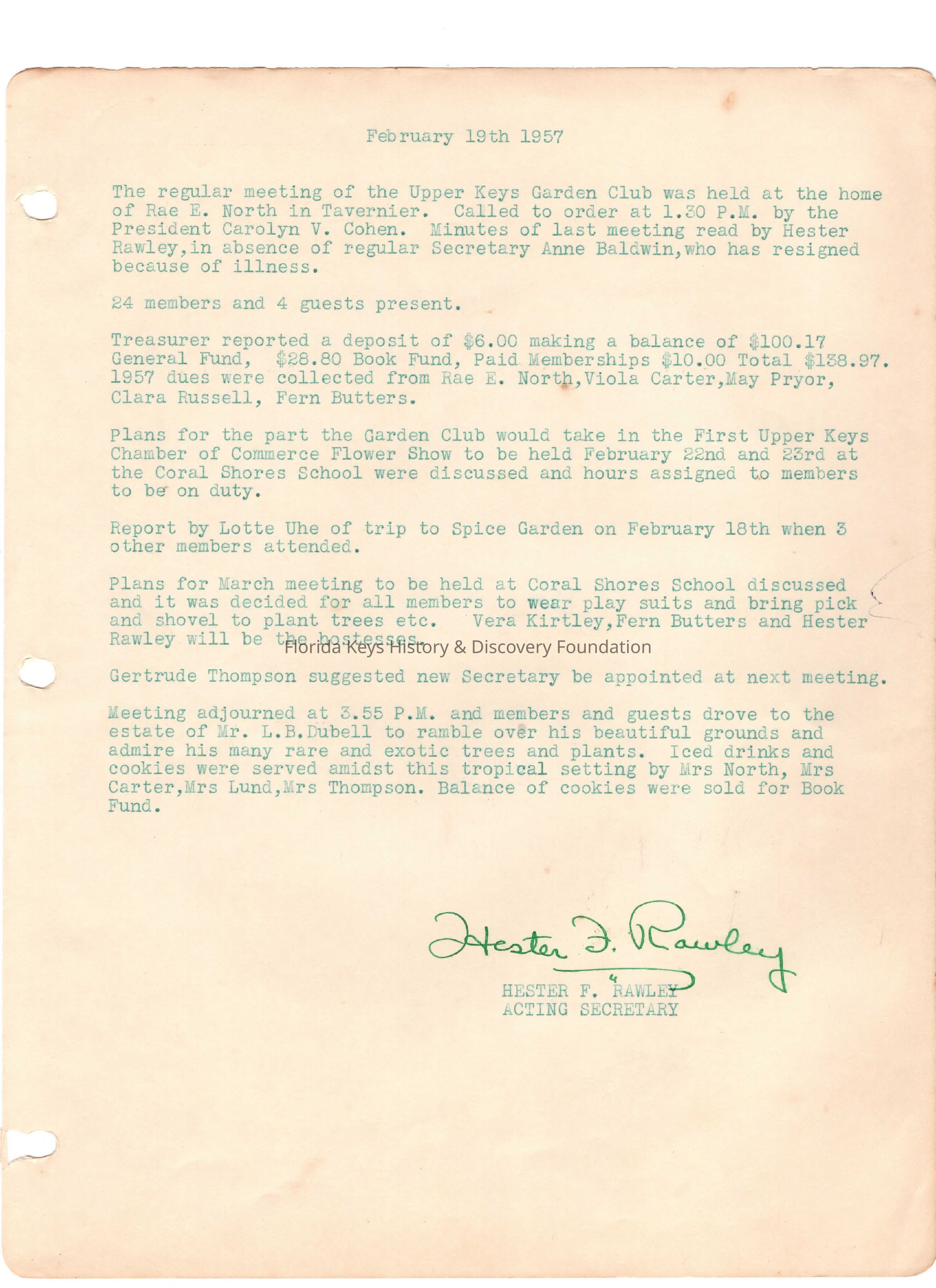 Minutes from club meeting held on February 19th, 1957 at the home of Rae E. North.Collection