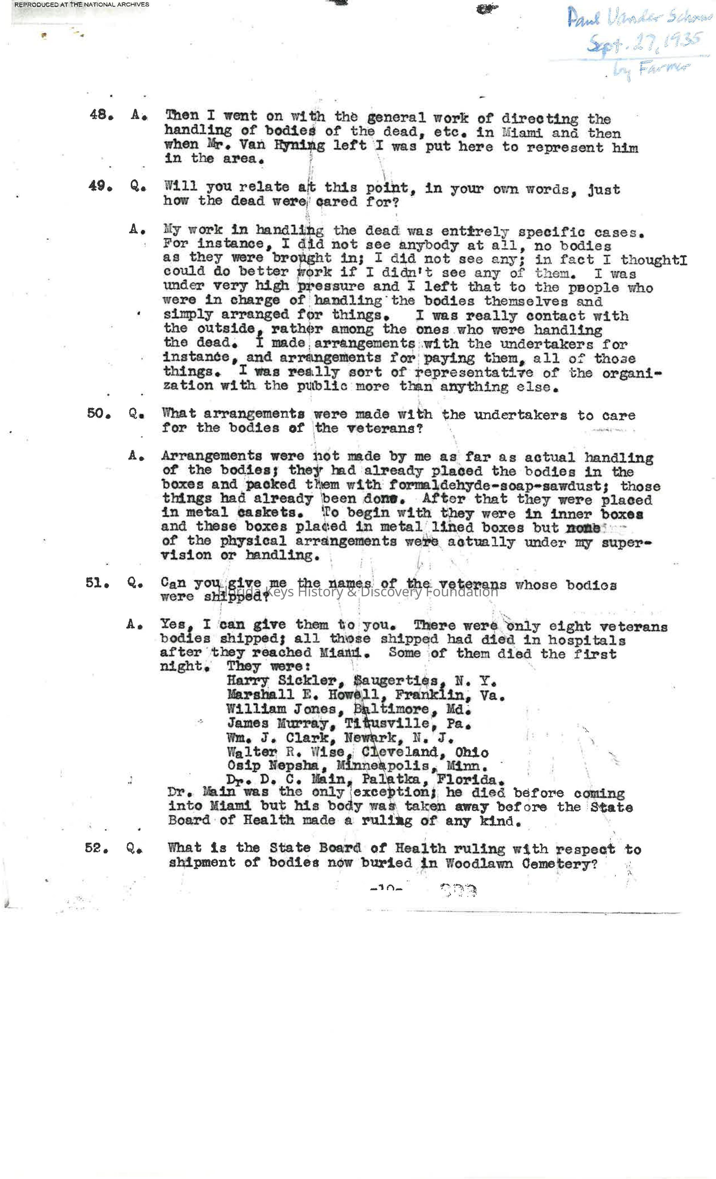Sept. 27, 1935, "Responses made under oath by Paul Vander Schouw, Assistant State Director of the Transient Division of the FERA, Exchange Building, Jacksonville, Florida, to questions propounded by H. W. Farmer, Investigator, at Miami, Florida, Sept. 27, 1935"Creator