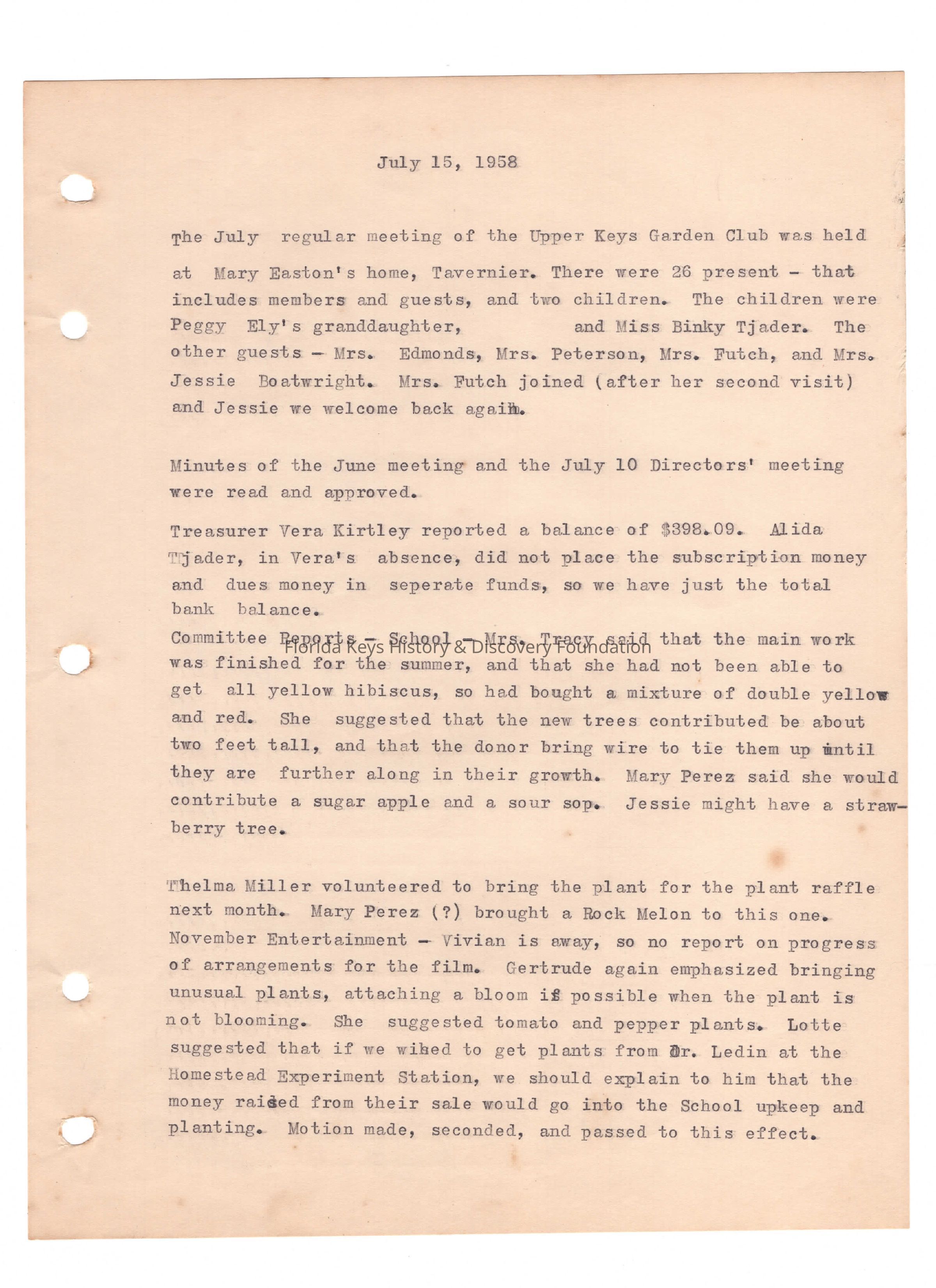 Minutes from club meeting held on July 15th, 1958 at the home of Mary EastonCollection