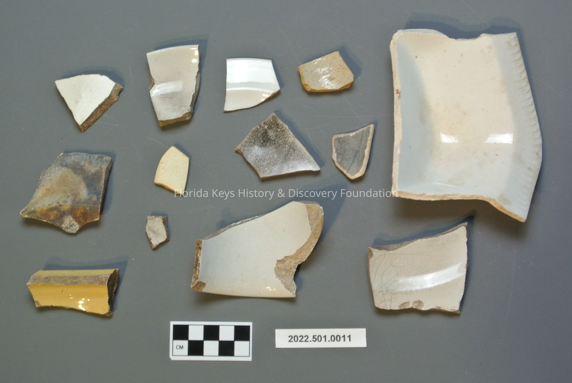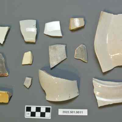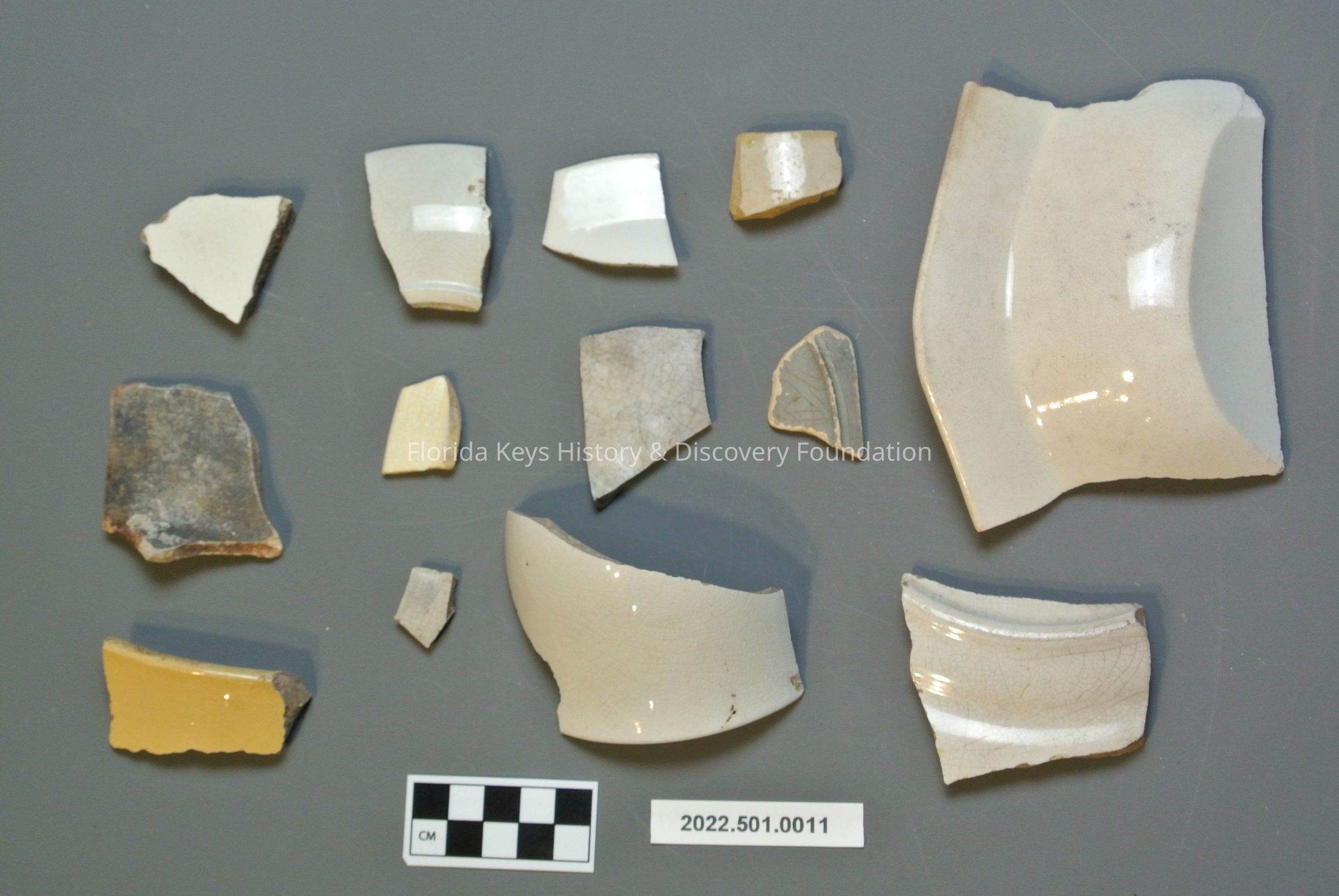 Group of ceramic sherds in assorted colors. Mainly white, one yellow, one beige, and three grey.Collection