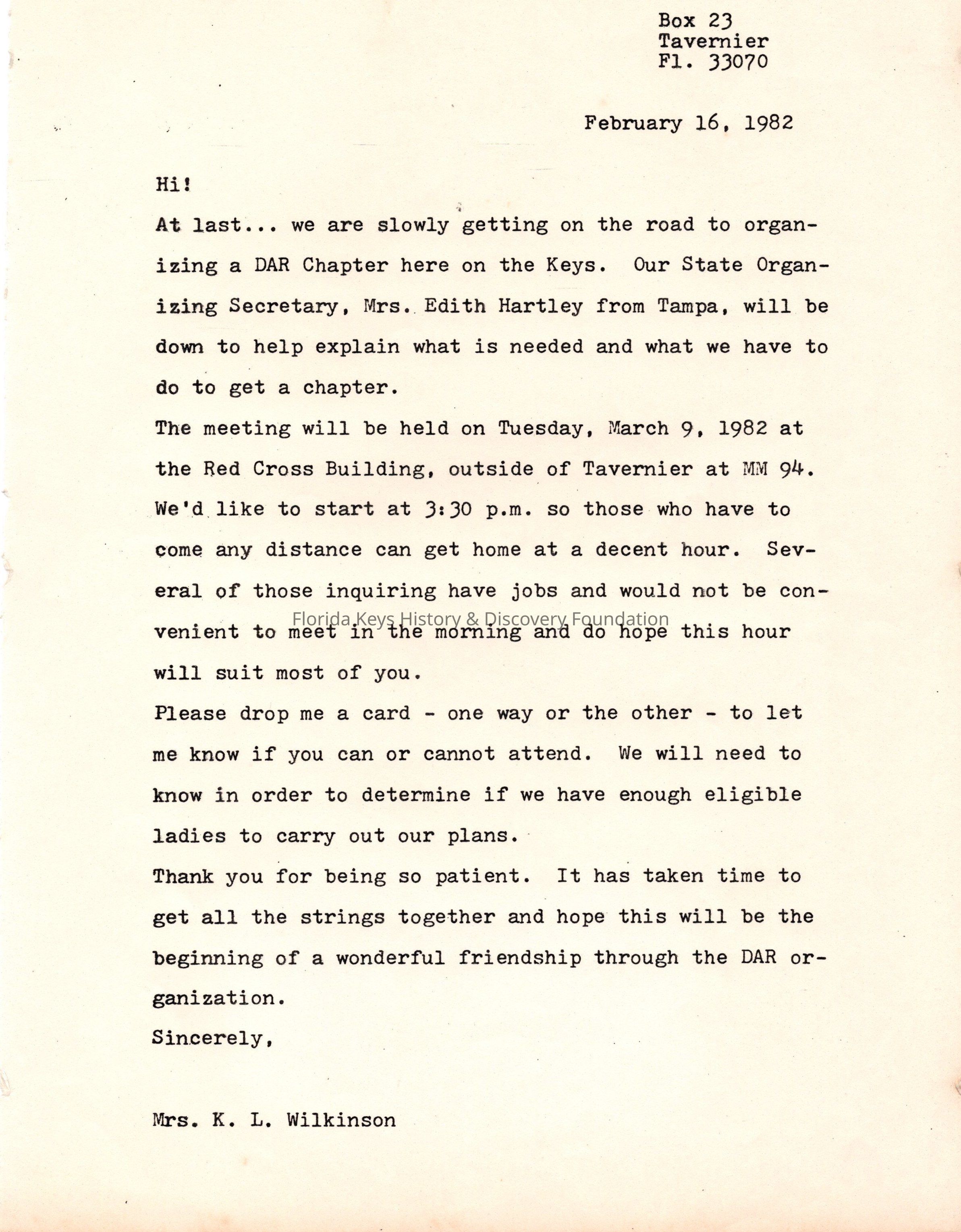 Organizing Florida Keys DAR, 1982Entry/Object ID