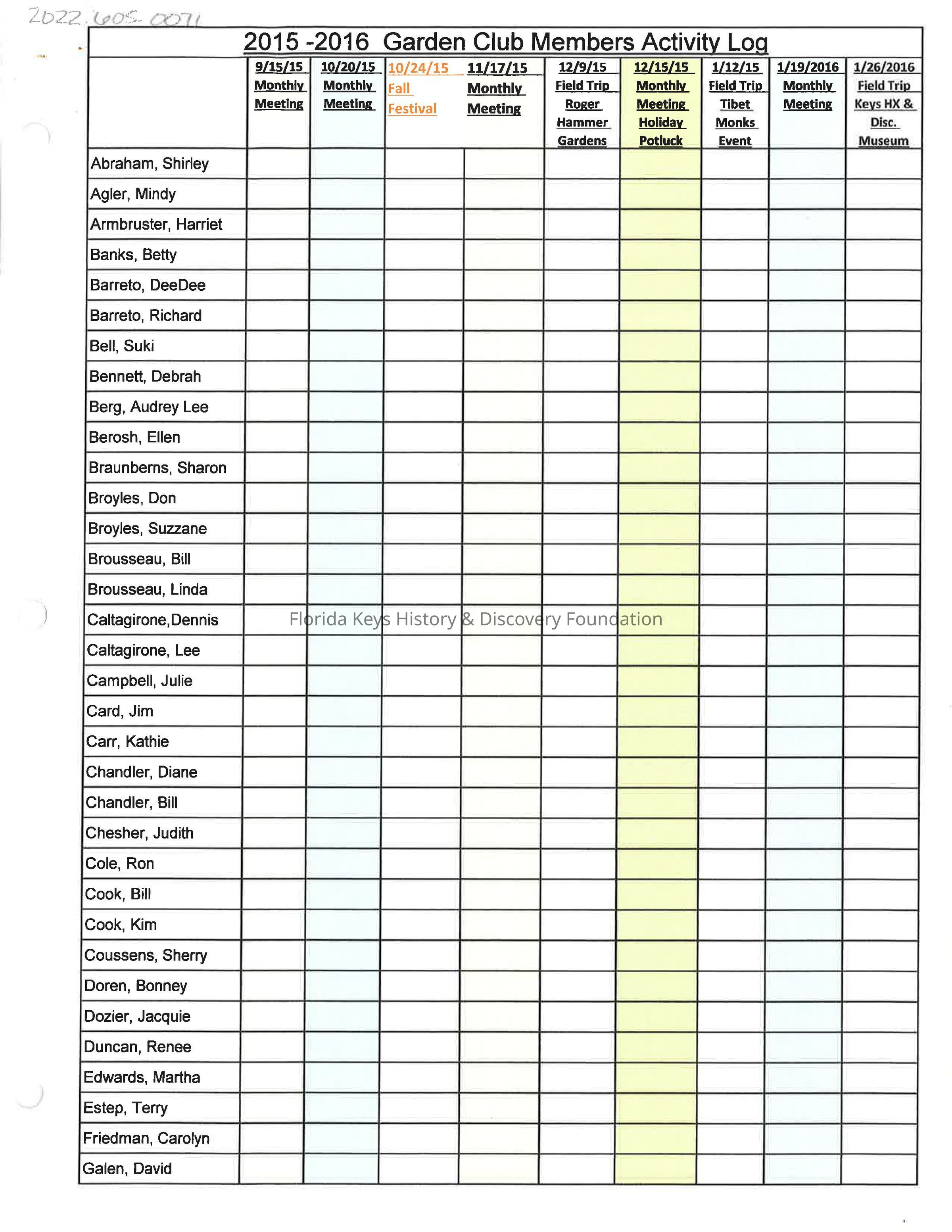 An unused 2015-2016 Garden Club Members and New Members Activity Log, gives names of all members from this season.