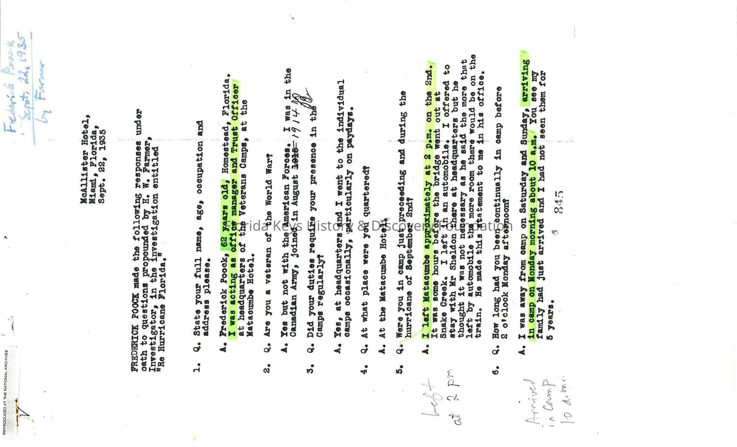 Sept. 22, 1935, "Frederick Poock made the following responses under oath to questions propounded by H. W. Farmer, Investigator, in the investigation entitled 'Re Hurricane Florida.'"Creator