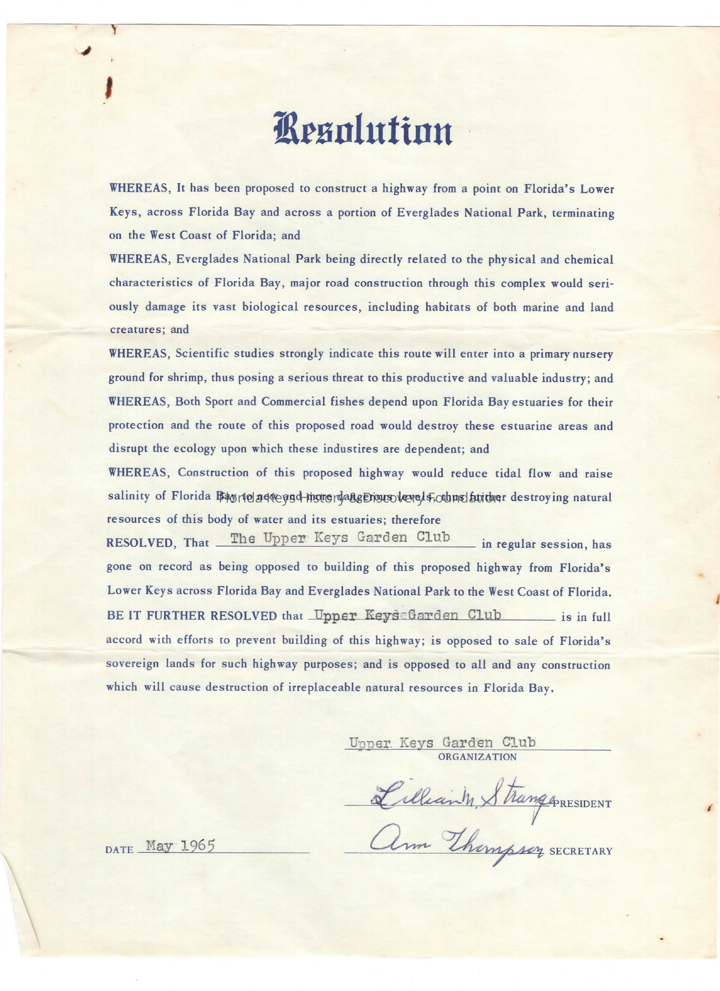 Resolution from May 1965 that states that the Garden Club is opposed to the building of a highway through the Florida Keys.Collection