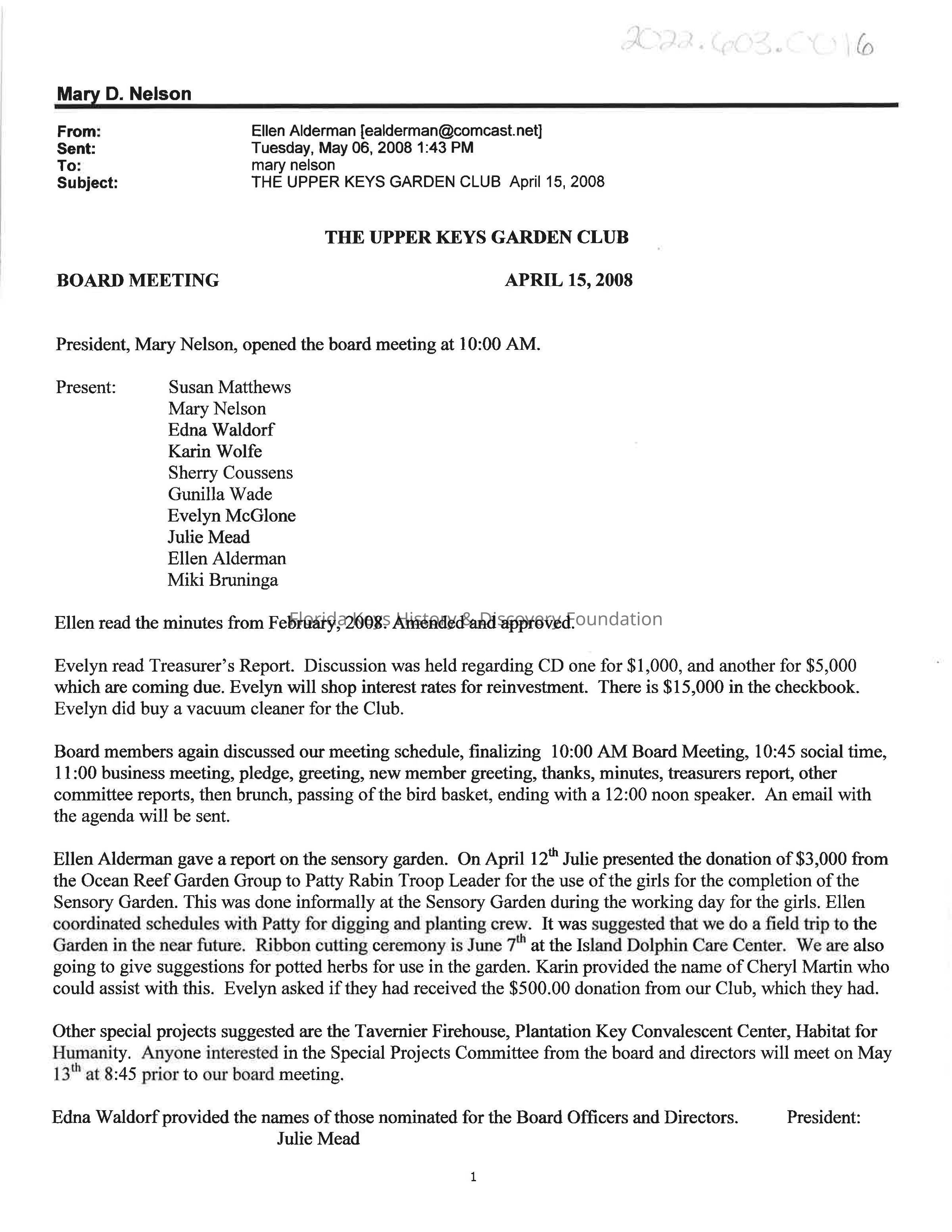 Email from Ellen Alderman to Mary Nelson of Board Meeting Minutes from April 15, 2008.