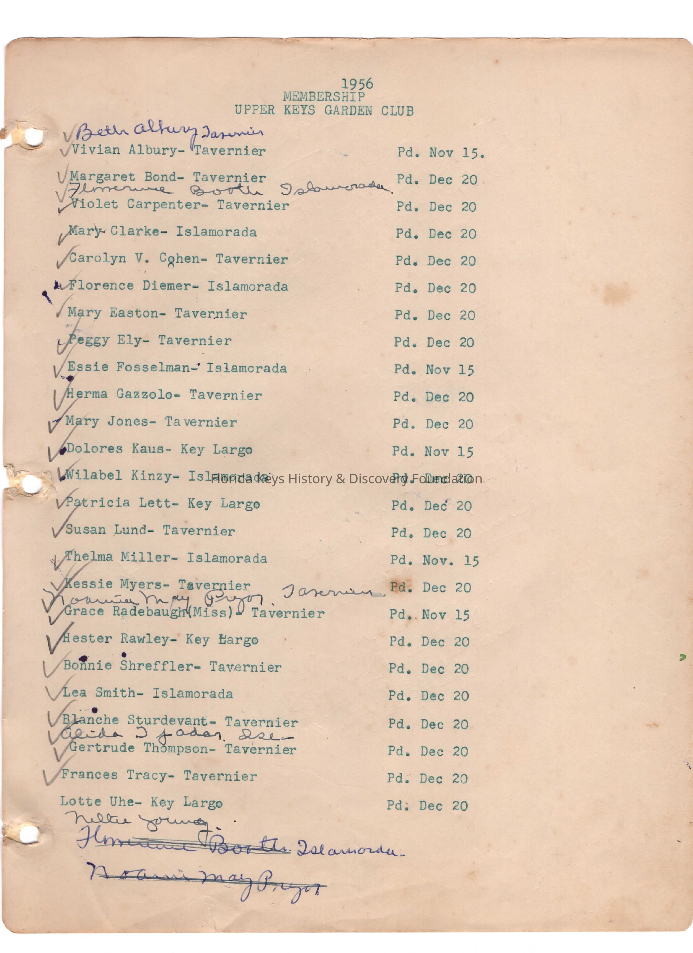 1956 Upper Keys Garden Club Membership ListCollection