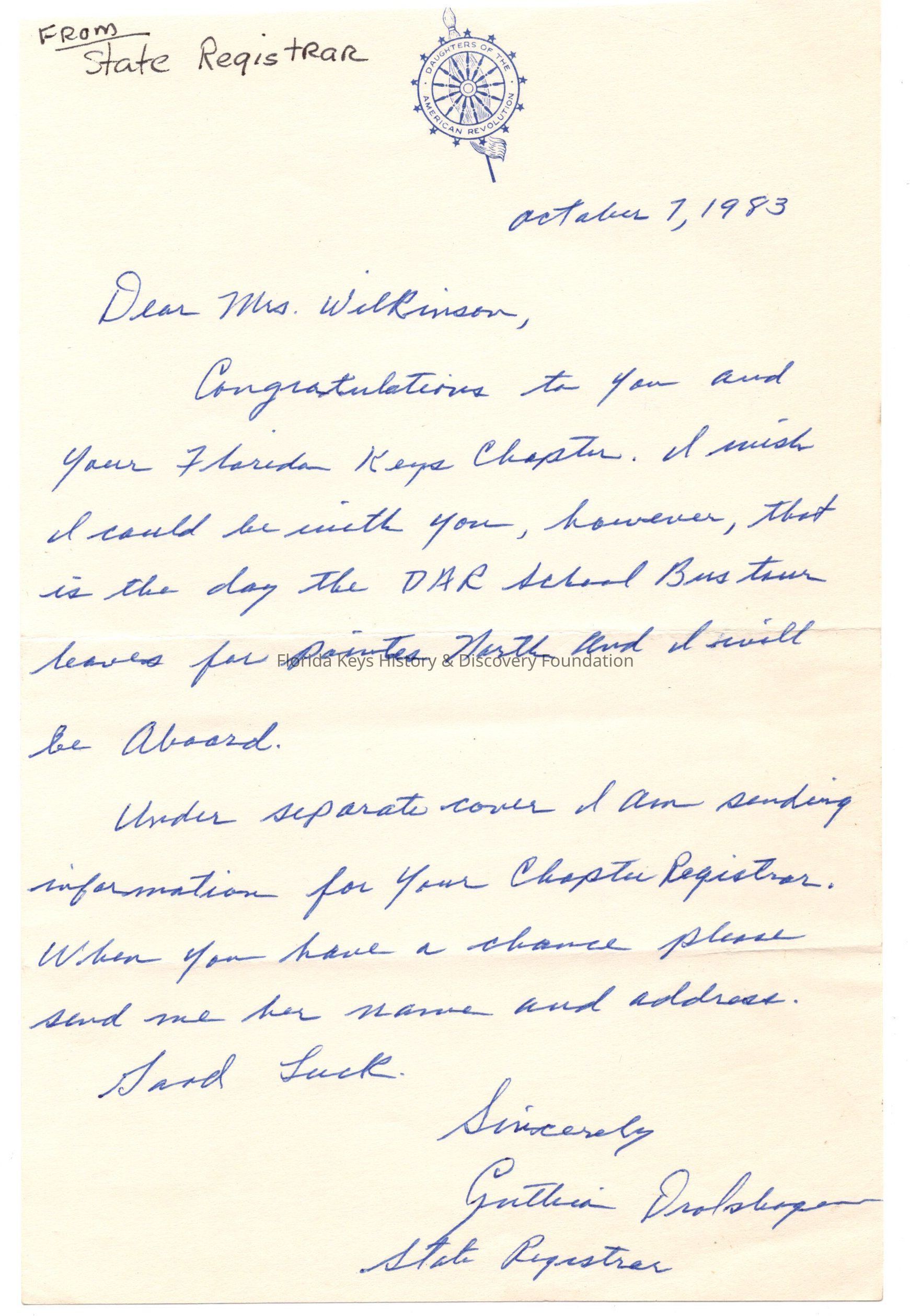 Letter from State Register to Mrs Wilkinson, 1983Entry/Object ID