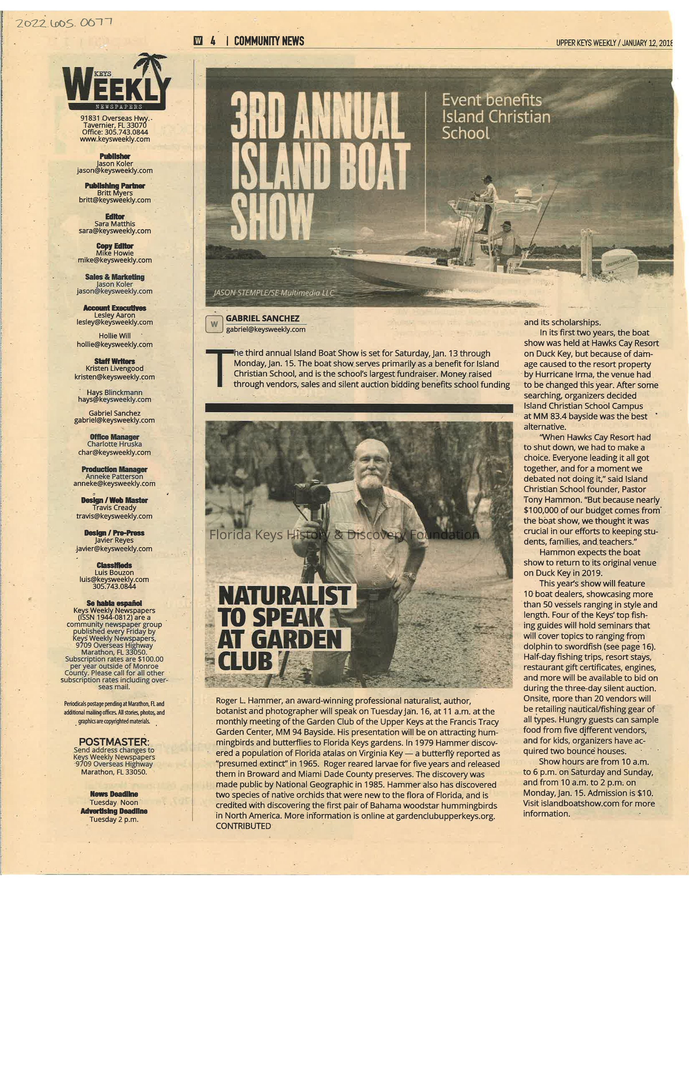 "Naturalist to Speak at Garden Club" contributed piece in Keys Weekly Newspaper from January 12, 2018Description