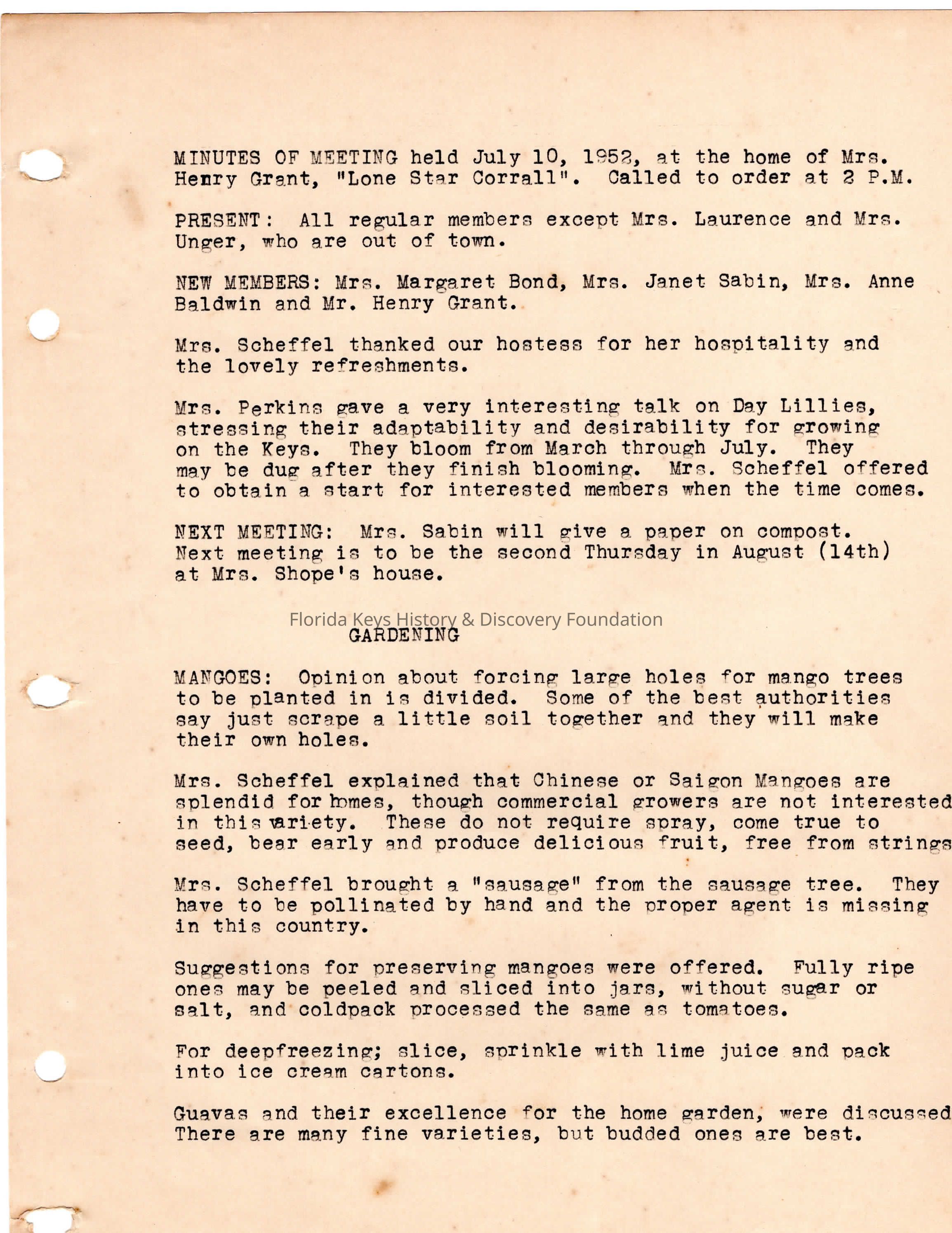 1950s, GCUK, Minutes, 1952, Key Largo Garden ClubScope and Content