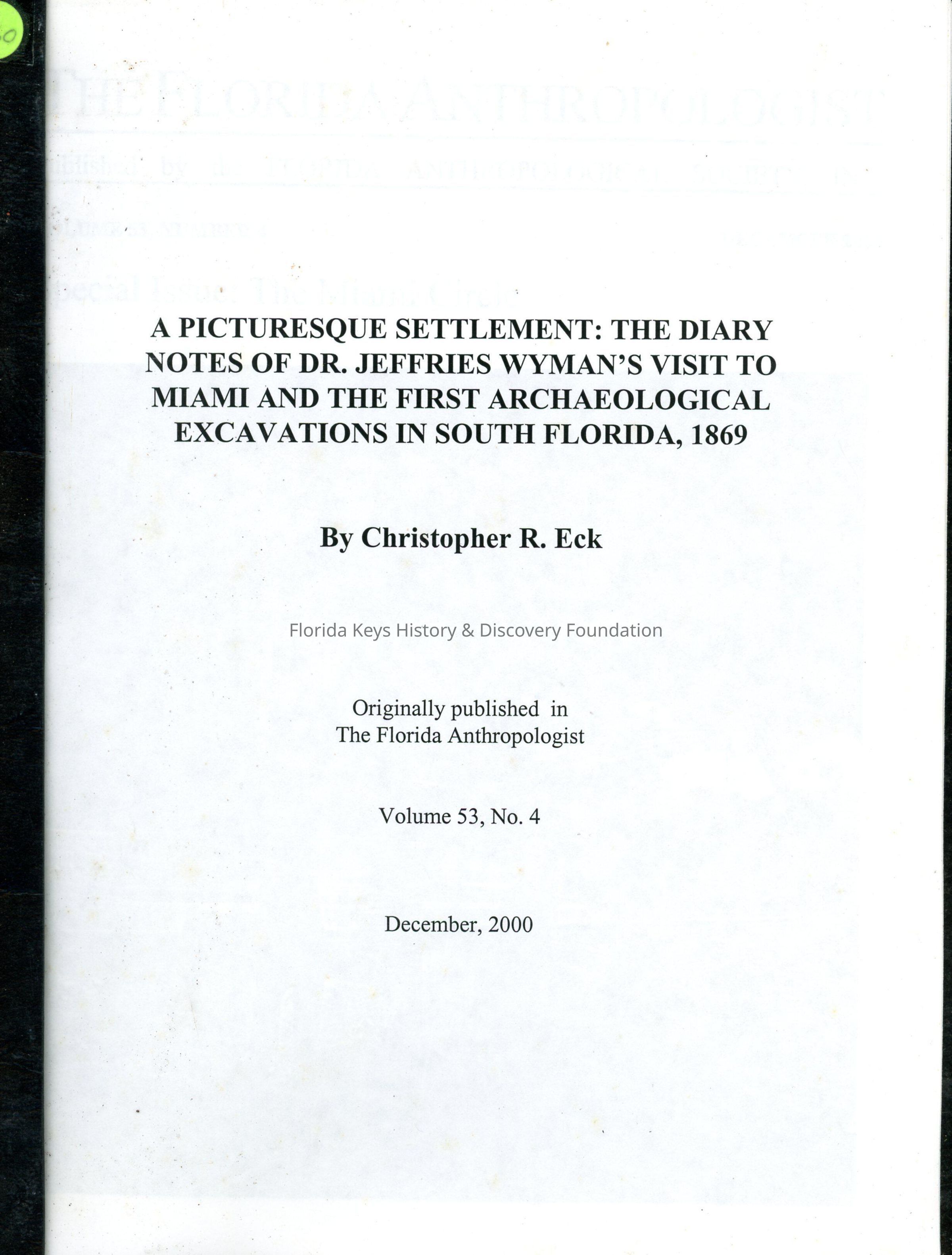 A Picturesque Settlement: The Diary Notes of Dr. Jeffries Wyman's Visit to Miami and the First Archaeological Excavations in South Florida, 1869Entry/Object ID