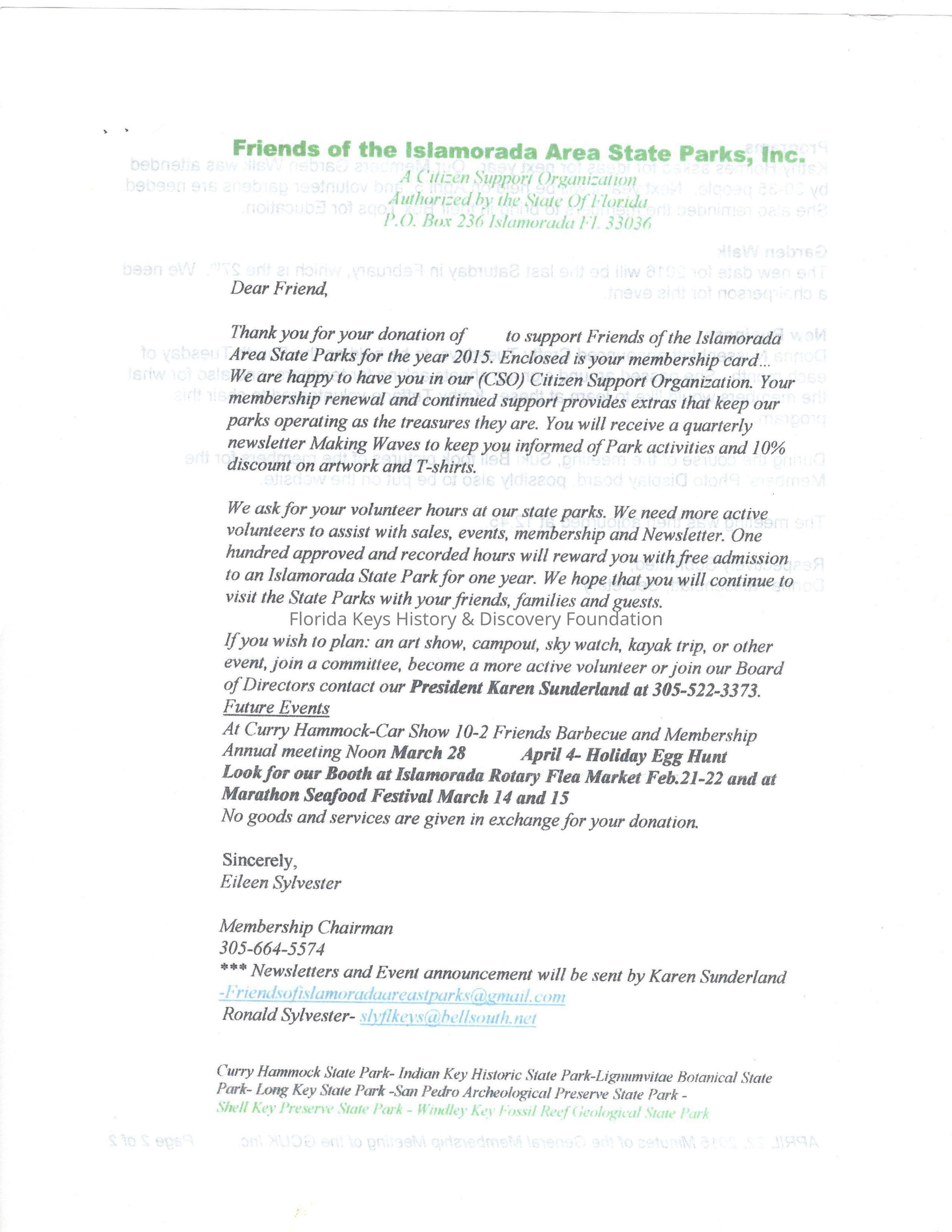 Letter from the Friends of the Islamorada Area State Parks, Inc. thanking for their donation and providing their membership card and includes some future events.