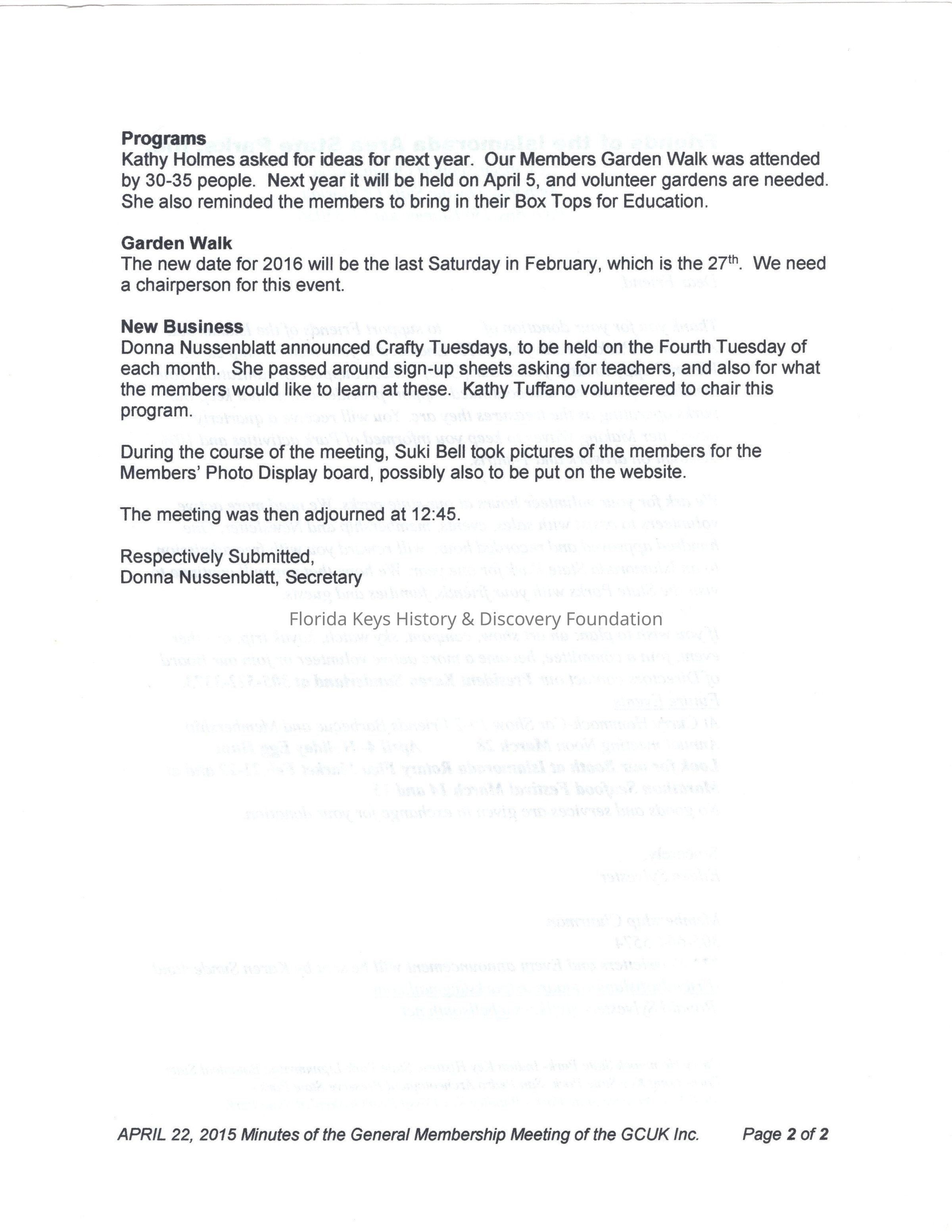 The back of the document includes page 2/2 from April 22, 2015 Minutes of the General Membership Meeting of GCUK.Address