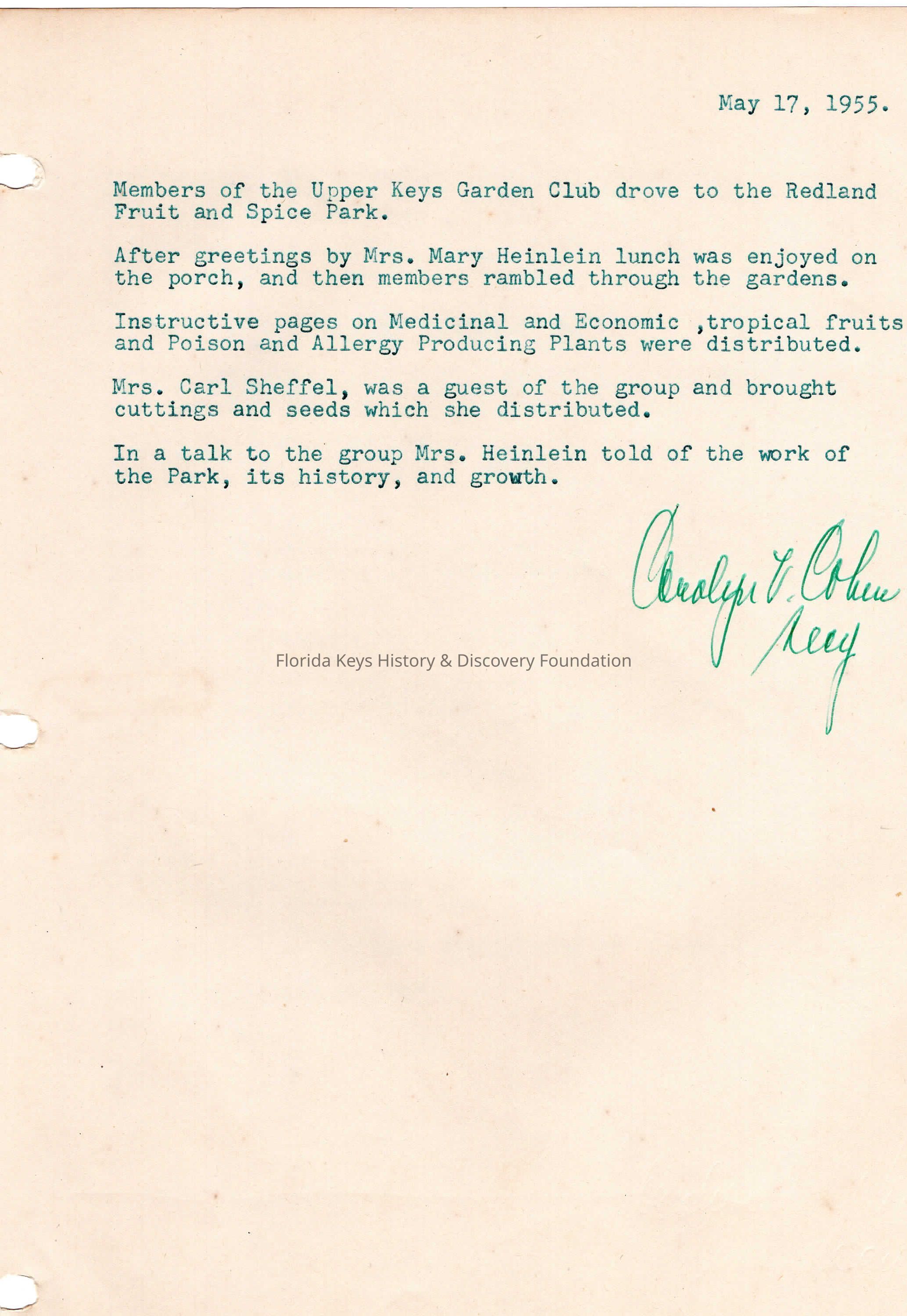 Minutes from club meeting held on May 17th, 1955 at the Redland Fruit and Spice Park.Collection