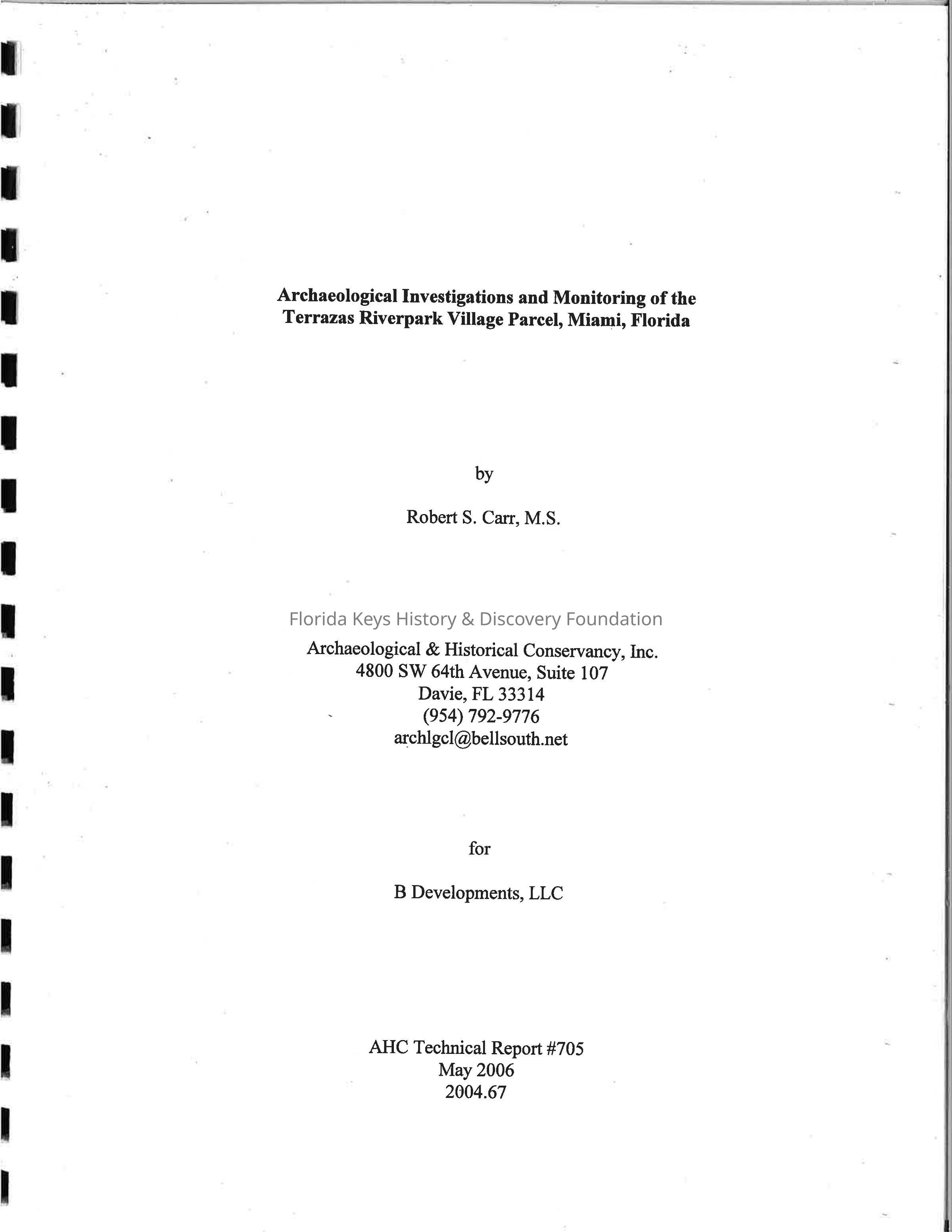 Archaeological Investigations and Monitoring of the Terrazas Riverpark Village Parcel, Miami Florida by Robert S. Carr, M. S.Entry/Object ID