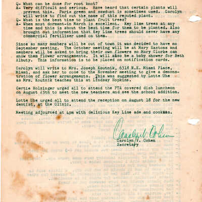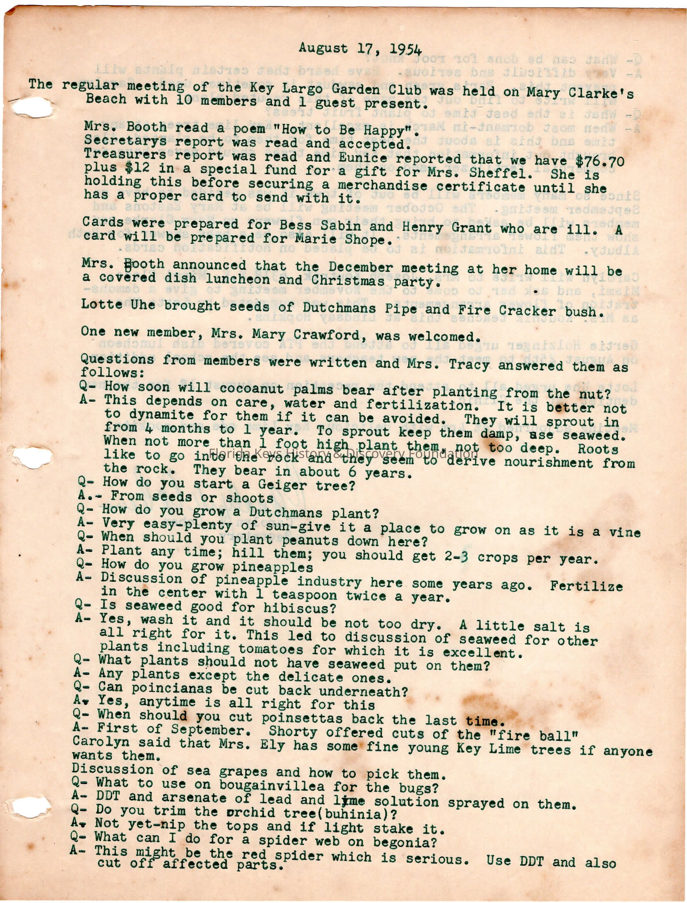 Minutes from club meeting held on August 17th, 1954 held on Mary Clarke's beach.Collection