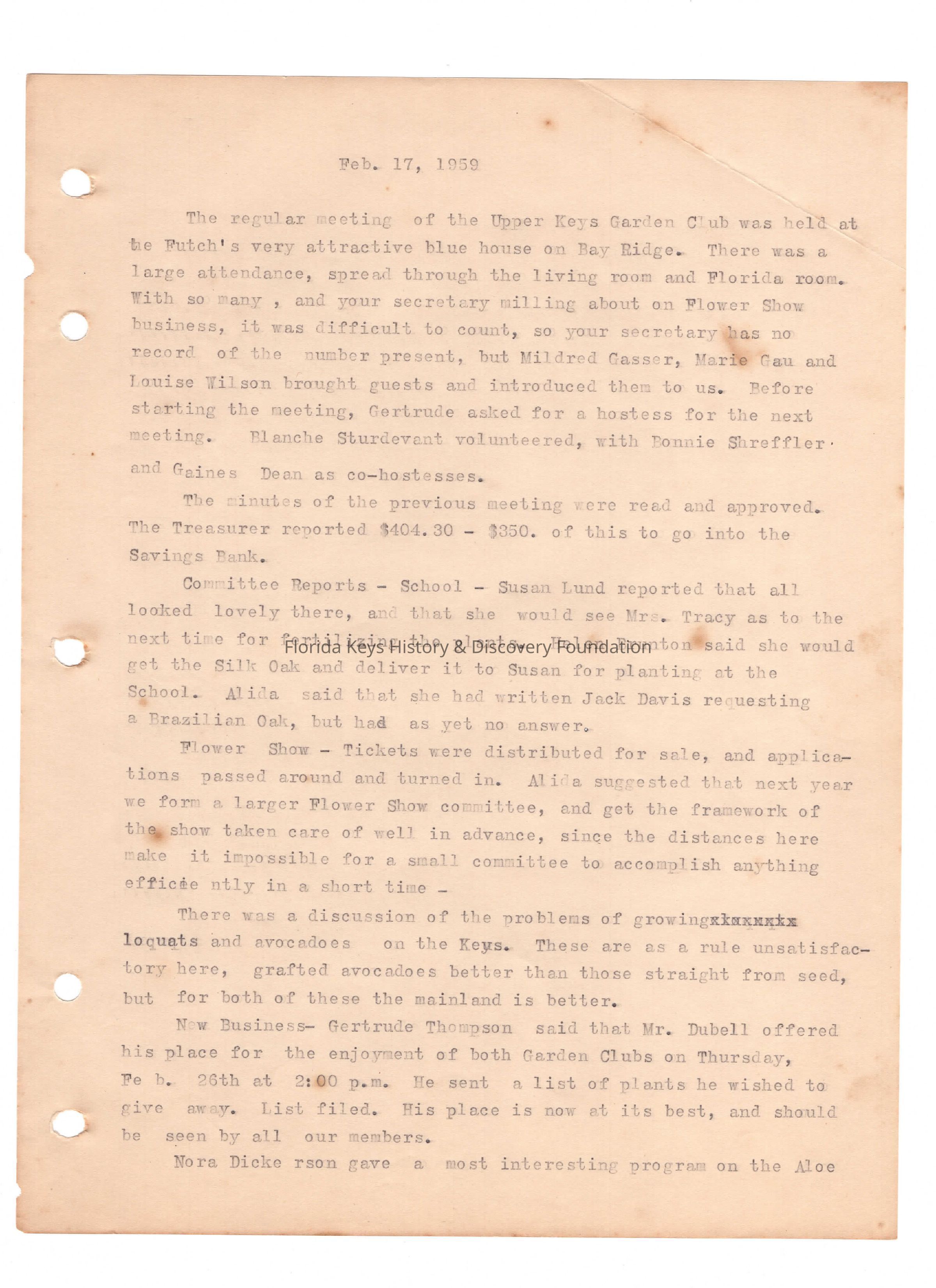 Minutes from club meeting held on Feb. 17th., 1959.Collection