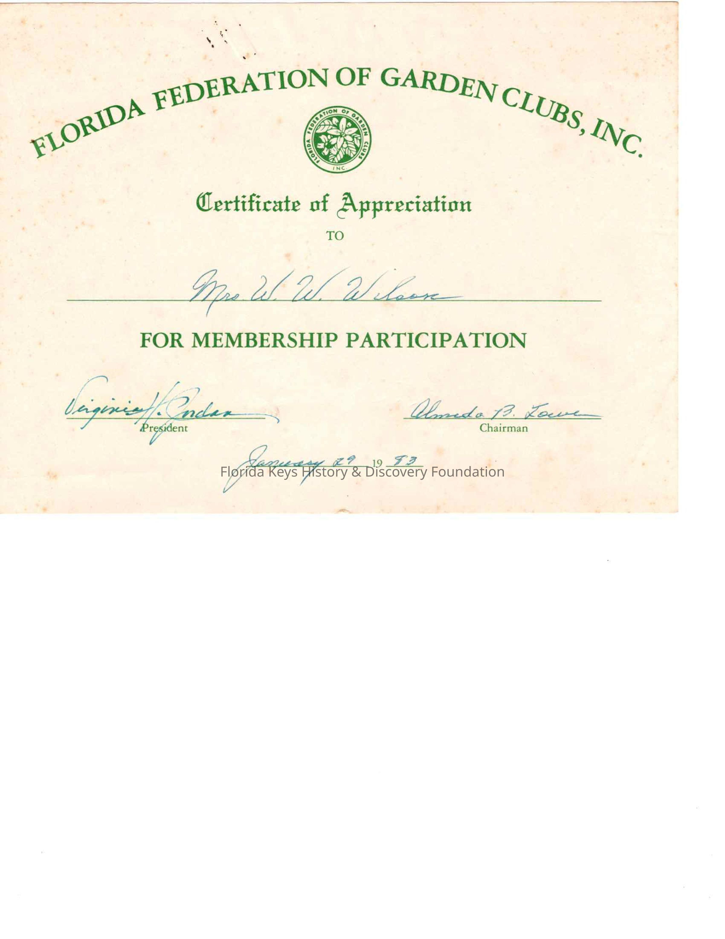 This is a Certificate of Appreciation dedicated the Betty Wilson from the Florida Federation of Garden Clubs for Membership Appreciation. This one is inscribed from January 19, 1983. This was tucked into Wilsons 1983-1984 yearbookCollection