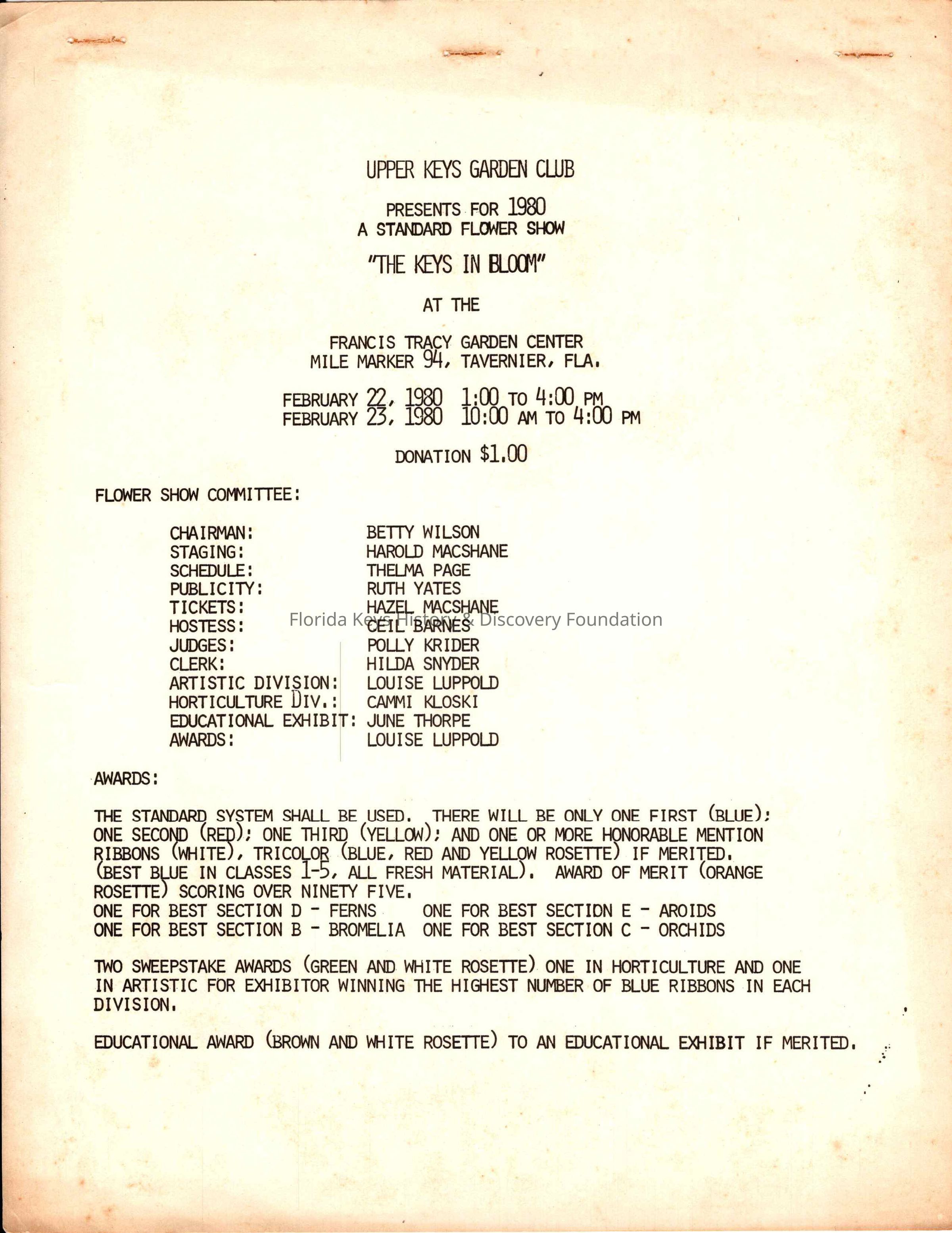 This document is from the GCUK 1980 flower show "The Keys in Bloom"; it covers the standards for awards, the rules for each category, and a score sheet.Cataloged By