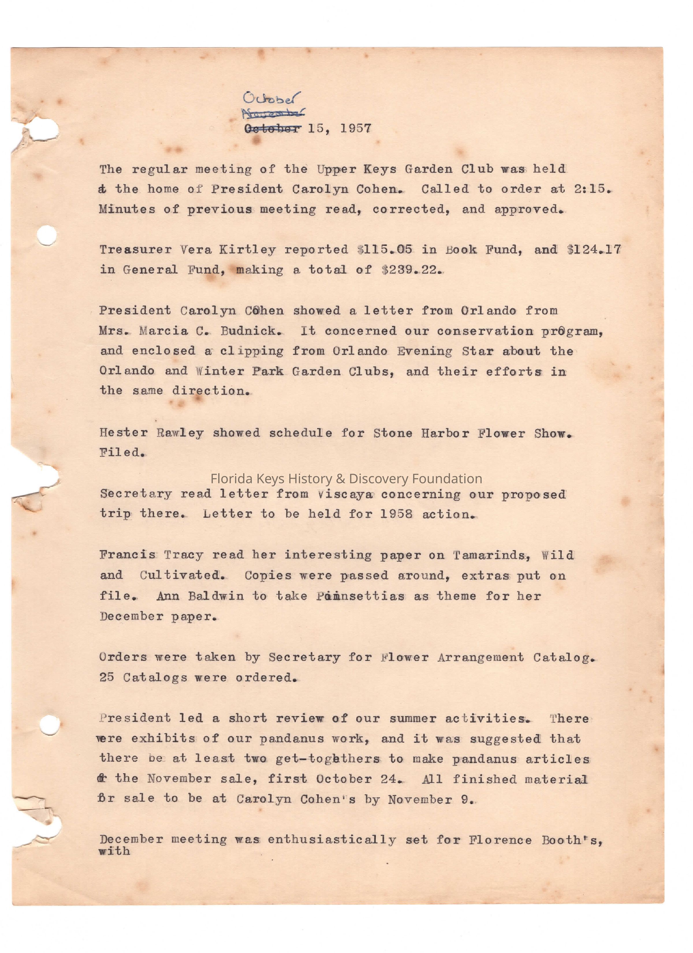 Minutes from club meeting held on October 15th, 1957 at the home of Carolyn Cohen.Collection