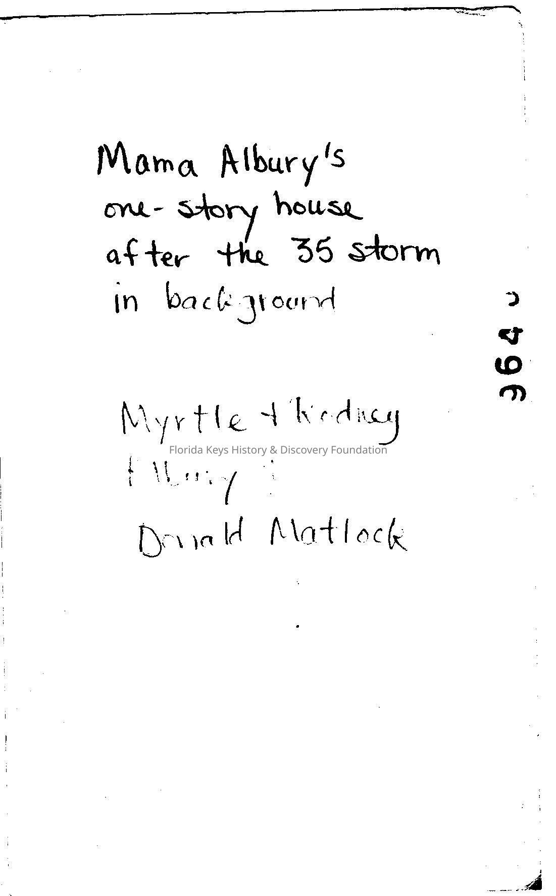 back of photo with caption "Mama Albury's one-story house after the 35 storm in background, Myrtle and Rodney Albury and Donald Matlock"Collection