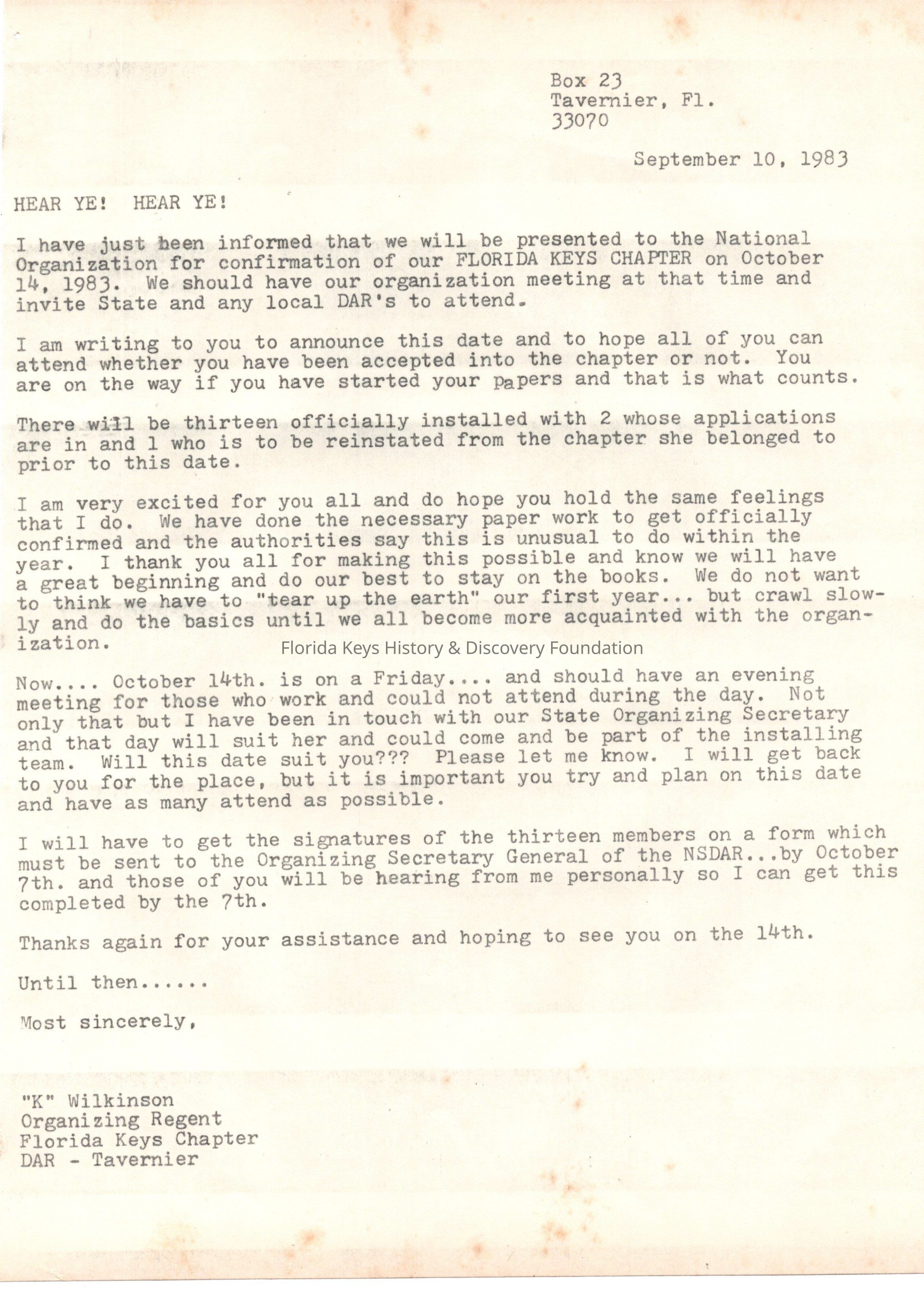 Confirmation of FLORIDA KEYS CHAPTER, October 1983Entry/Object ID