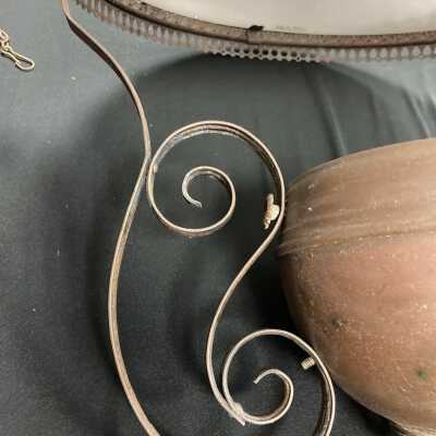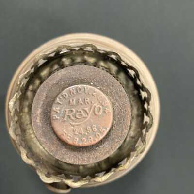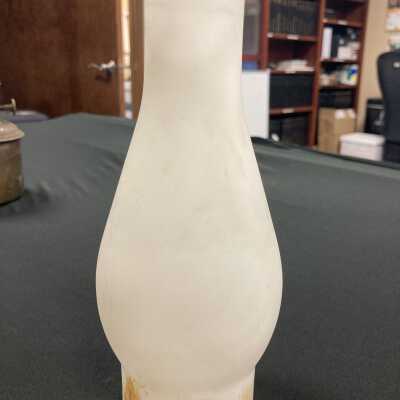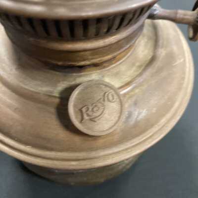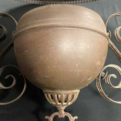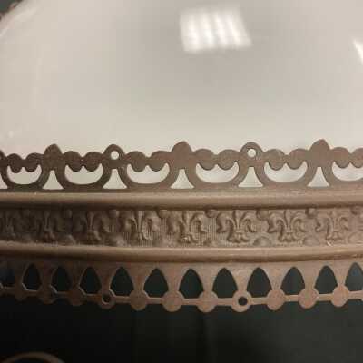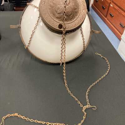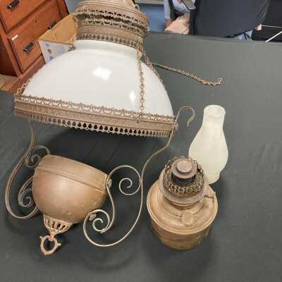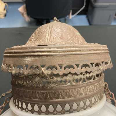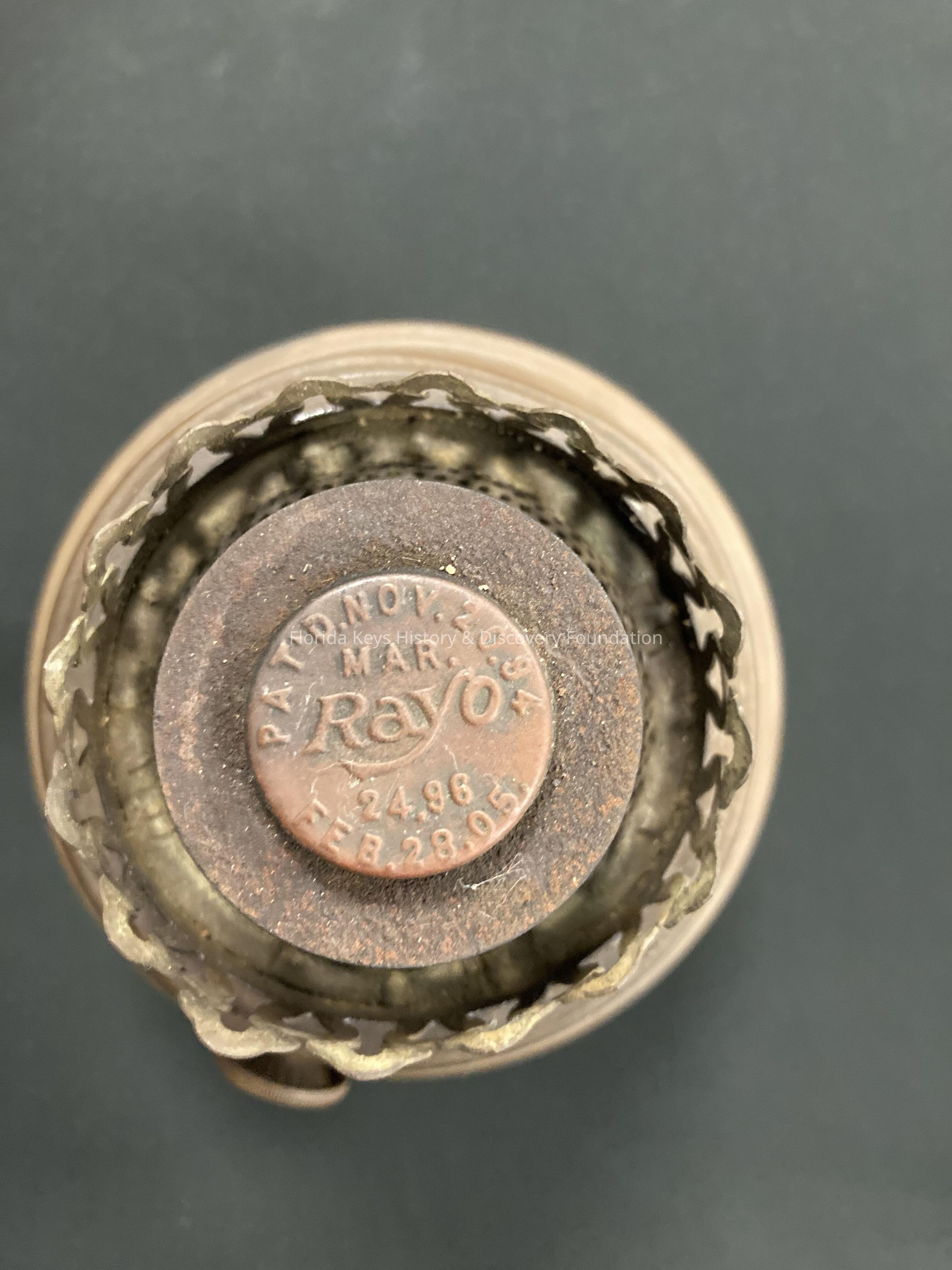 A. 25 1/2" Long, 34" long chain, 17" Wide at widest point, 14 1/4" diameter shade, 5 1/2" diameter bowl, 6 1/2" diameter crown. The majority of the object is made up brass with pressed inlay designs, mostly in a fleur-de-lis pattern with floral patterns on the crown, the shade is made of white colored glass. The arms have a spiral shape and are connected to the bowl by four bolts with flower shaped nuts, one of the nuts is missing. On the bottom of the bowl is a decorative element that looks like a cage with a decorative element hanging off. B. A white glass chimney 7 3/4" long, 2 3/8" diameter lower opening, 1 1/2" diameter top opening, 3" diameter at widest point. C. 7 3/4" tall, 4 7/8" diameter base, 1 3/4" opening in middle of base, floral applique on turning knob, 4 1/2" tall reservoir, 3 1/2" tall central draft burner, on reservoir is a cap that says "Rayo" it appears this is where the reservoir was filled with oil. On the top of the central draft burner is a decorative collar and stamped on the very top is "Pat'd. Nov. 20. 94/ Mar/ Rayo 24.96/ Feb. 28.05."Use