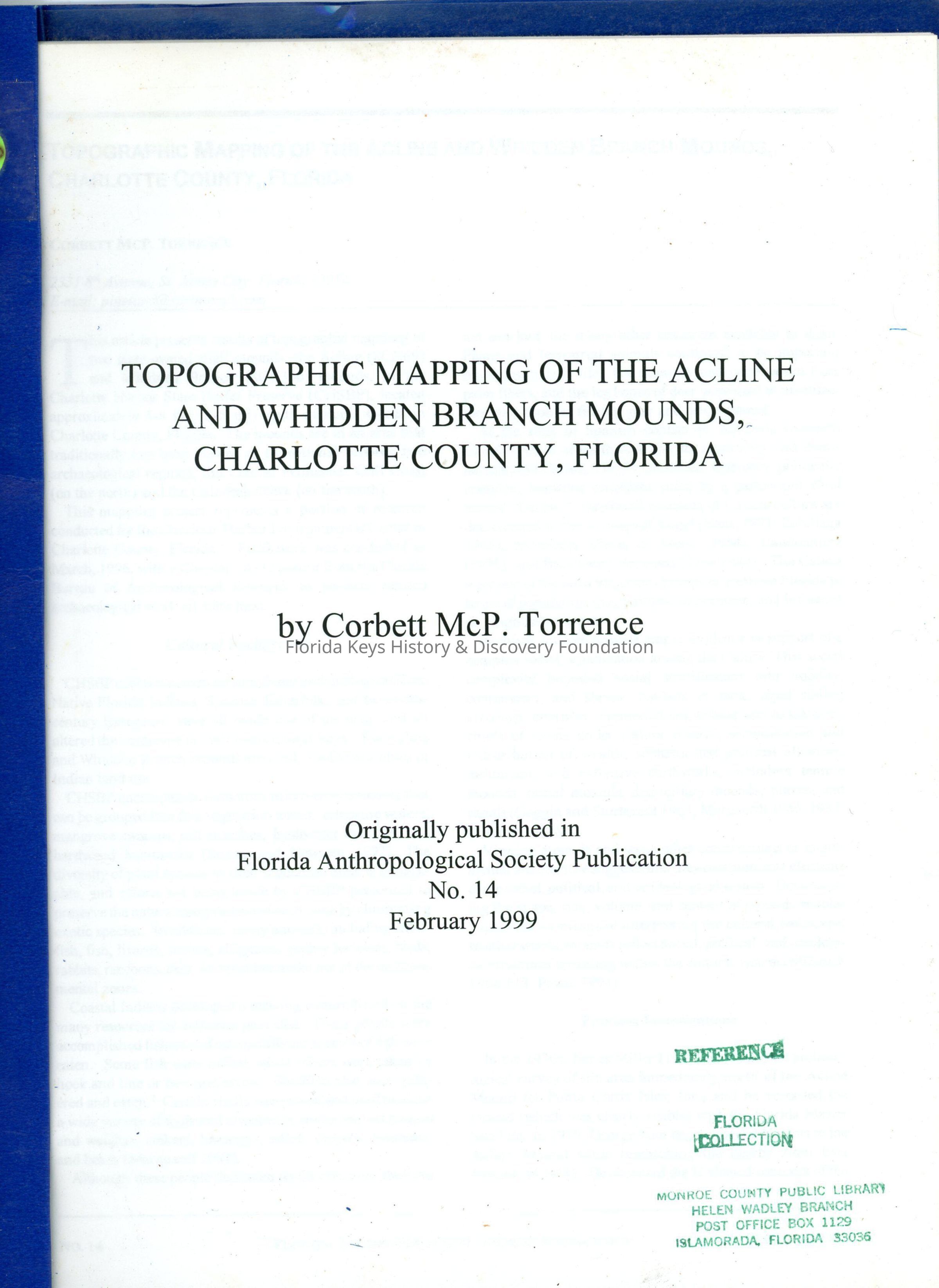 Topographic Mapping of the Acline and Whidden Branch Mounds, Charlotte County, FloridaEntry/Object ID