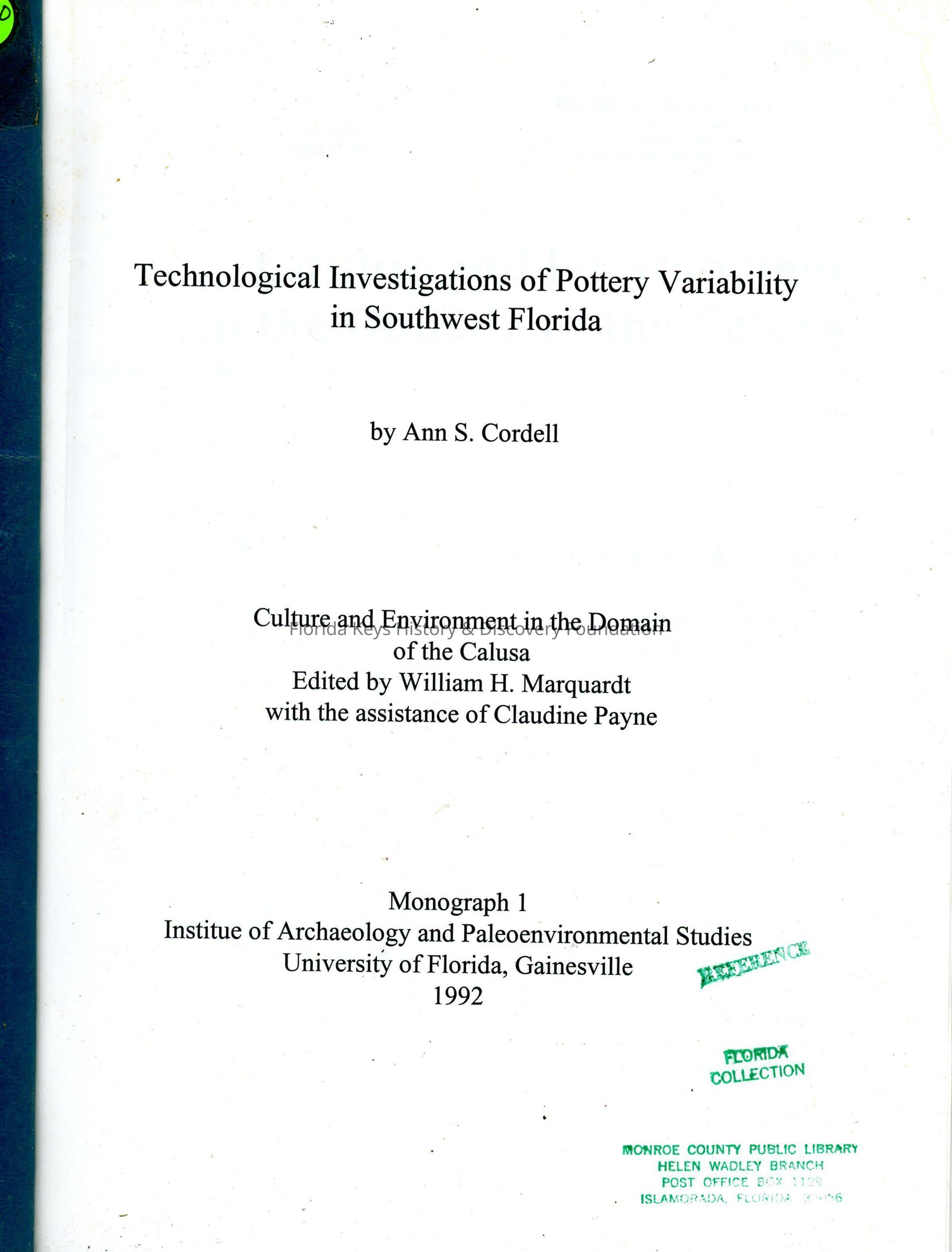 Technological Investigations of Pottery Variability in Southwest FloridaEntry/Object ID